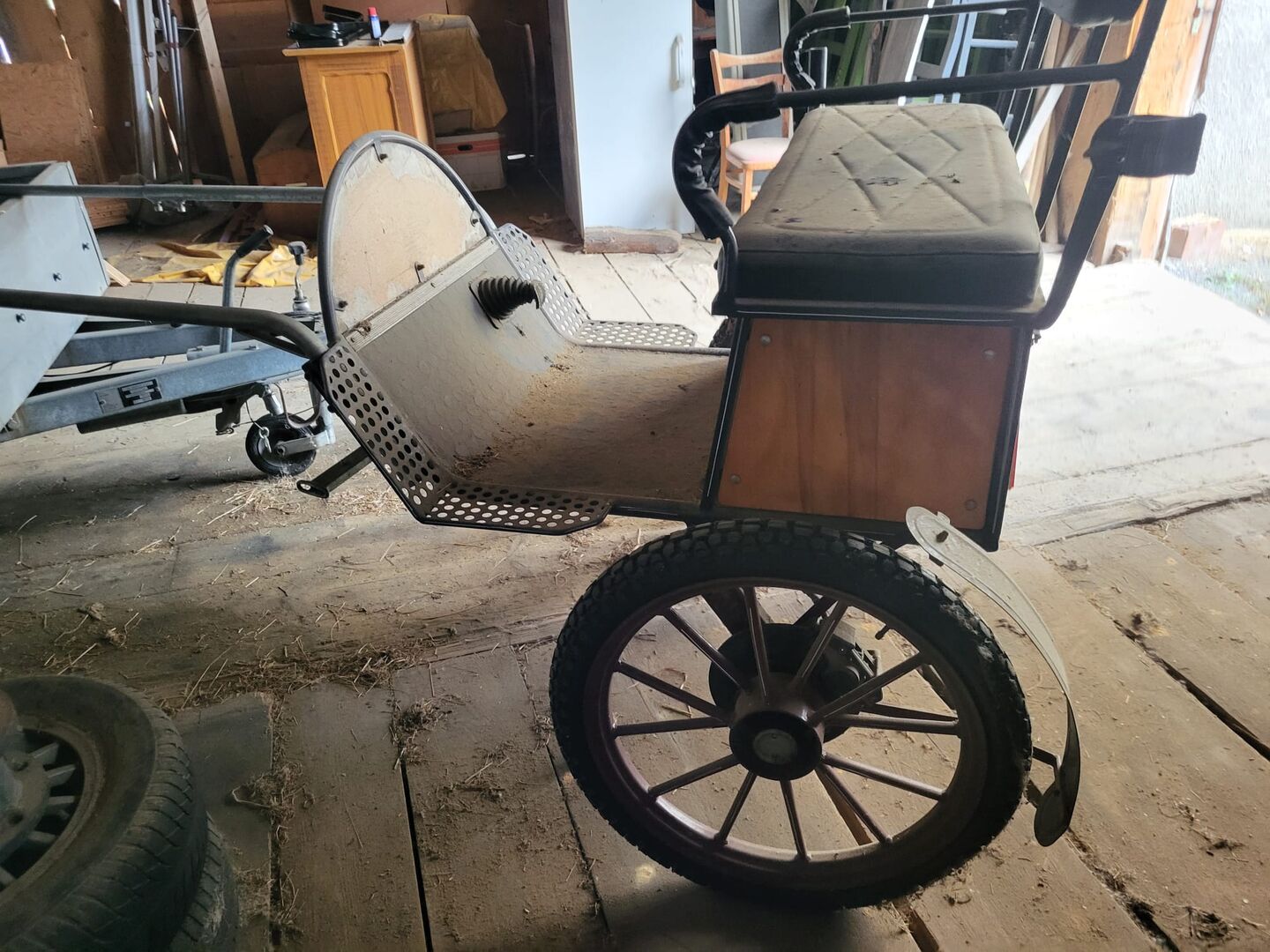 Sulky / vagn - Vacker, elegant, sportig begagnad sulky / vagn Fåtölj i svart läder Trädelar - Bordeaux - Svartlackerad I gott skick Har inte använts på mycket lång tid Kan ses och förhandlas på plats