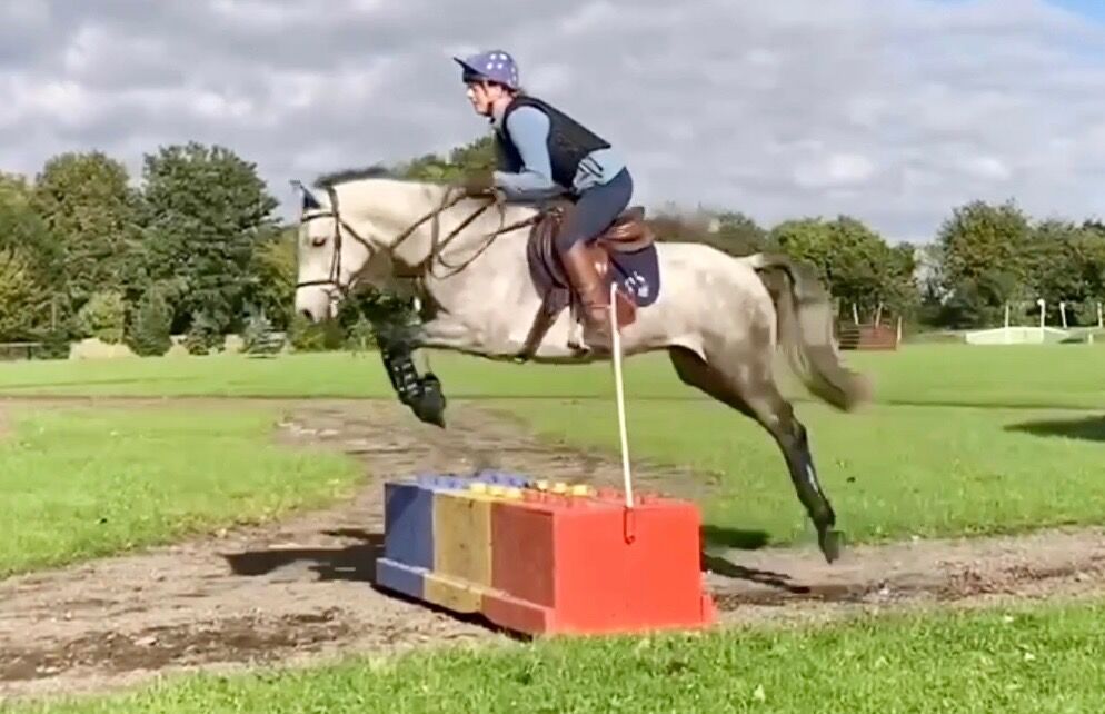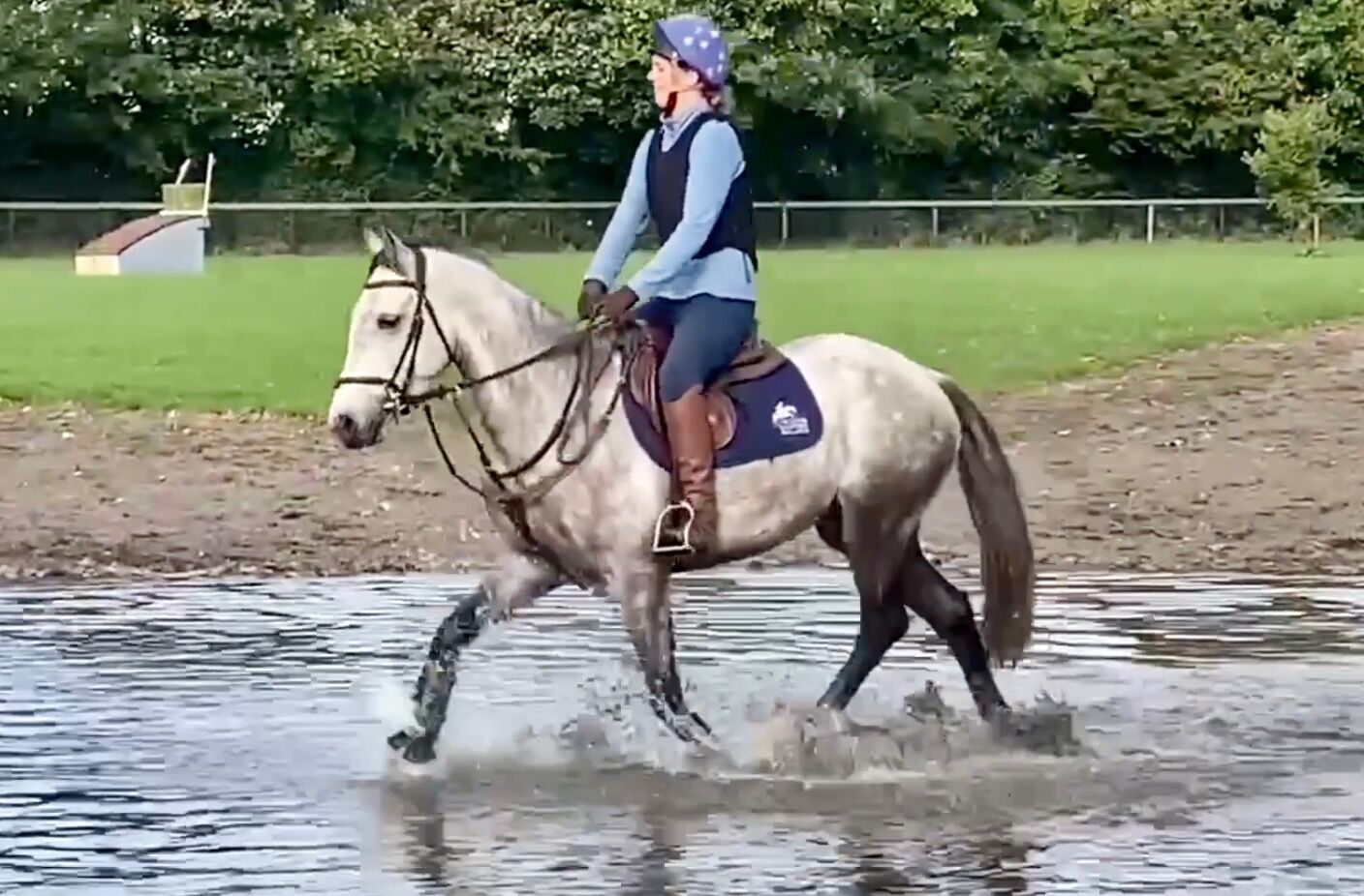 He moves beautifully on the flat. Has a lovely mouth and a very natural outline. Correct foundations ready for someone to build on. Lunges nicely. SJ & XC schooled. Easy to a fence. Forward going and takes his rider without being rude. XC schooled over ditches, steps, brightly coloured fences and water. Good in open spaces. Not phased by other horses schooling nearby. Safe, level headed and fun.