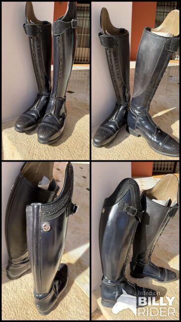 bespoke dressage boots . dark navy leather with black seude and shark skin trim. Toughened exterior calf 35cm inside leg floor to top 45cm Back height floor to top 47cm outside height to highest point floor to top 52cm