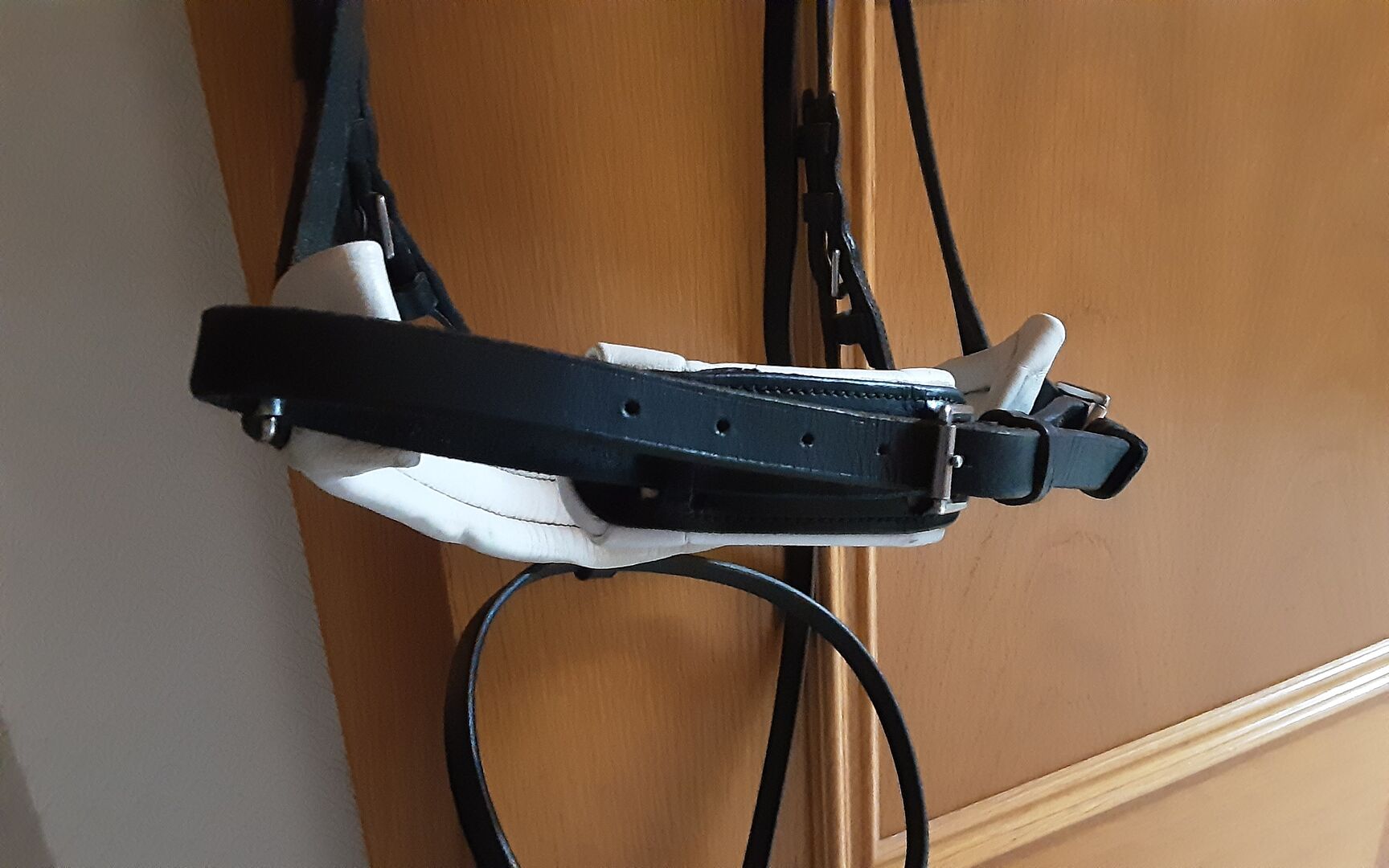 Svart patentsniffel i storlek Wb, med lädertyglar - Jag erbjuder min vackra svarta patentträns i storlek Warmblood/Full (passade min Friesian). Det svenska nosgrimman har ett vitt foder på nosgrimman och löper över stoppningen på utsidan av halsen.