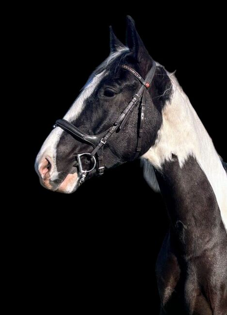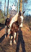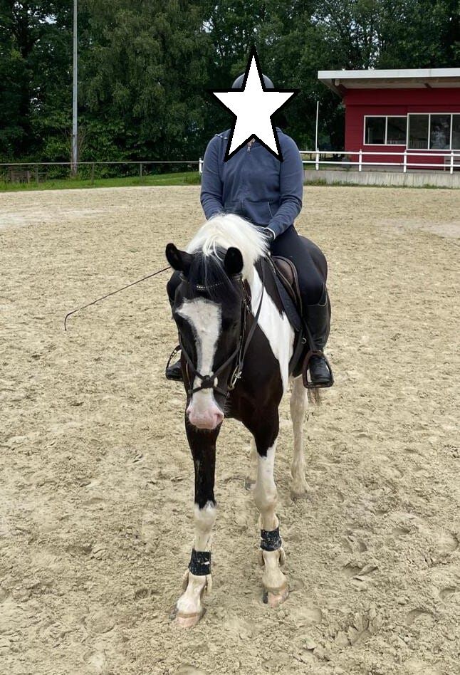 Dyngus (Pablo) - en polsk sporthästvalack född 2019 i den iögonfallande och mycket vackra färgen svart pinto. Med en höjd på cirka 1,70 m och en storramad, harmonisk byggnad täcker han också långa ryttare bra. Han har en komplett stamtavla, är frisk, PSSM1 n/n-testad och hans lilla inköpsundersökning från juni 2024 var utan anmärkning. Han är för närvarande fyrskodd, men kan också hållas barfota utan problem. Dyngus är en exceptionellt snäll, vänlig och människovänlig valack i den dagliga hanteringen. Han är jämn i humöret, nyfiken, gosig och lär sig mycket snabbt. Han förlåter ridfel, är lätt att rida och rids för närvarande av en ungdom utan problem. Dyngus är också helt okomplicerad: Han är lätt att hantera hos veterinären och hovslagaren och är väluppfostrad. I flocken är han rangcentrerad och kompatibel med både ston och valacker. Han bor i ett öppet stall eller lekhage och en artanpassad hållning med mycket motion och social kontakt är fortfarande önskvärt för honom. Han har en gedigen grundutbildning under sadel. Han är säker i alla tre grundgångarterna samt för hand och i skritt, skänkelvikningar / sidvärtsrörelser, framåt/bakåtvändningar, bakåt etc. Dyngus kommer att fortsätta att utbildas och kan några trail- och working equitation-hinder (bro, klockgång, grind, stolplabyrint etc.) Han rids på engelska, men kan också den västra sadeln. Han har mycket längdåkningserfarenhet (även i svår + bergig terräng). Han är också säker på att resa ensam. Dessutom har han fått körträning med två hästar. Det visade sig att köra en vagn inte är hans sak och orsakar honom stress. Detta är också det ENDA skälet till att sälja honom, eftersom ägarna föredrar vagnkörning framför ridning på grund av sin egen hälsa. Annars är han en mångsidig, begåvad häst som redan har deltagit i olika kurser som dressyr, trail eller working equitation och tycker om att gå i vattnet. Dyngus är en alltigenom fantastisk häst med den bästa karaktären, ett vackert utseende och en bra utbildningsnivå - en sann hjärtats partner för människor som letar efter en pålitlig, lättsam häst som är villig att lära sig. Ytterligare videor finns tillgängliga på begäran.