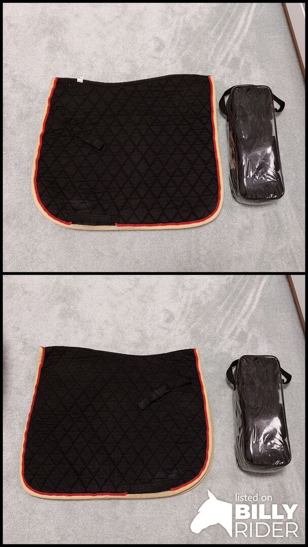 Svart schabrack med bandage varmblodigt dressyr WB DR rödgul ram - Till salu svart sadelpad med rödgul kant (tyska färger) med svarta bandage.
