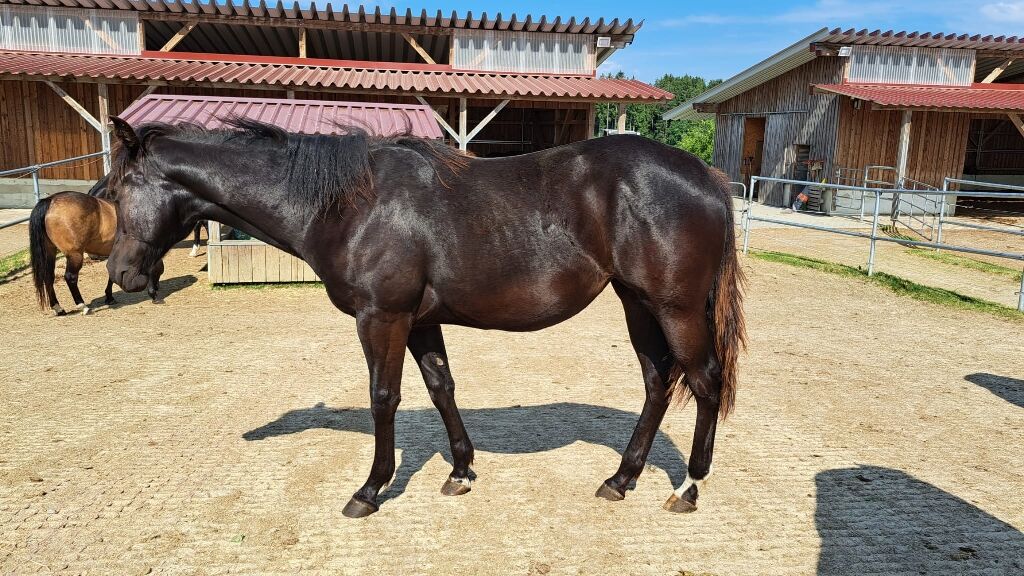 svart, vackert Quarter Horse-sto - Mycket härligt, människointresserat Quarter Horse sto i den fina färgen svart söker ett kärleksfullt, stöttande hem. Detta vackra sto kommer direkt från uppfödaren och är född 2022. Hon kommer att vara ganska storväxt och kommer att ha en uppskattad slutlängd på 152 till 154 cm. Luzi kommer att växa upp i en liten besättning med ston. Hon får högkvalitativt mineral- och kraftfoder samt hö och äng 24/7. Hon är väluppfostrad, tillitsfull och människokär. Hon känner till föl-ABC och regelbunden hovbeslag. Luzi har fullständiga papper och en bra allround/grundstamtavla. Hon är välkommen att stanna för avel. Luzi lovar att vara en bra partner för fritidsaktiviteter. Plats: 93191 Rettenbach