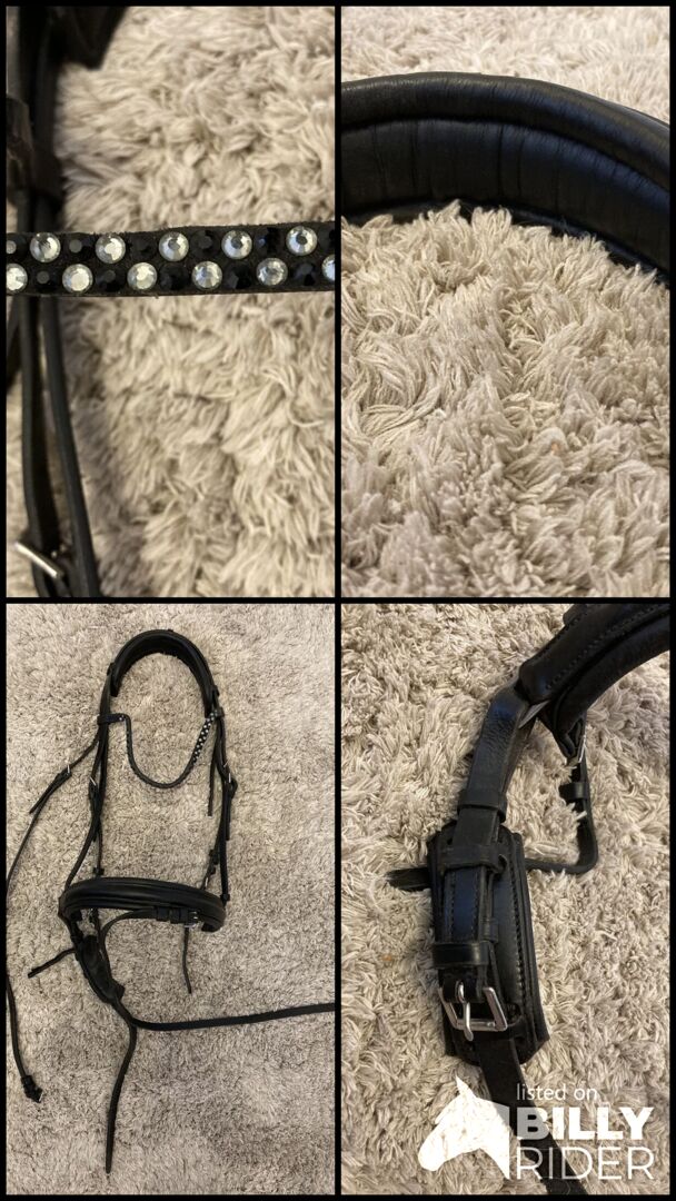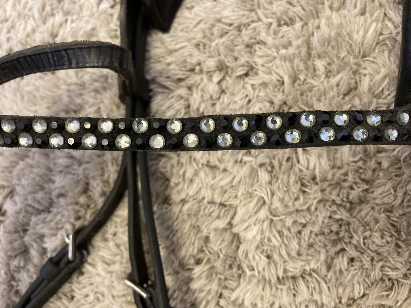 Svensk träns, porto betalt - 🖤Svenskt ridsällskap, böjt pannband med svarta och grå stenar. Anatomiskt format huvudstycke med öronuttag och stoppning för tryckkänsliga hästar. Mjukt vadderat näsband och hakrem. Silverfärgade beslag.