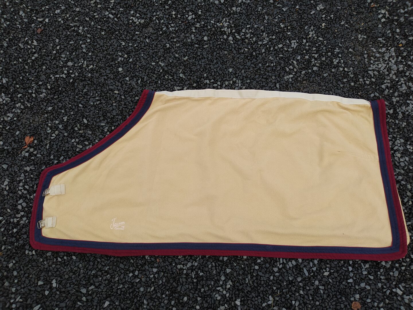 Svettmatta 135 - Jag erbjuder här min svettmatta i storlek 135. Den är beige med en mörkblå och vinröd bård. Inga hål och spännena är hela. Filten är nytvättad.