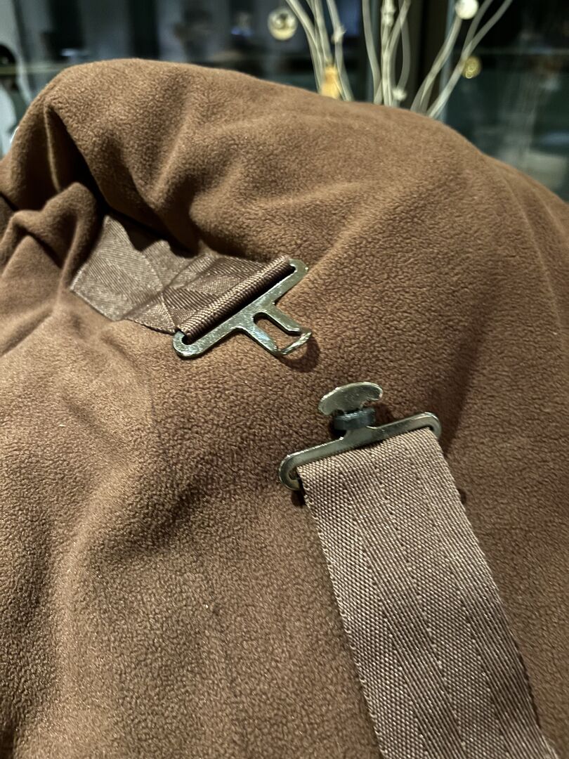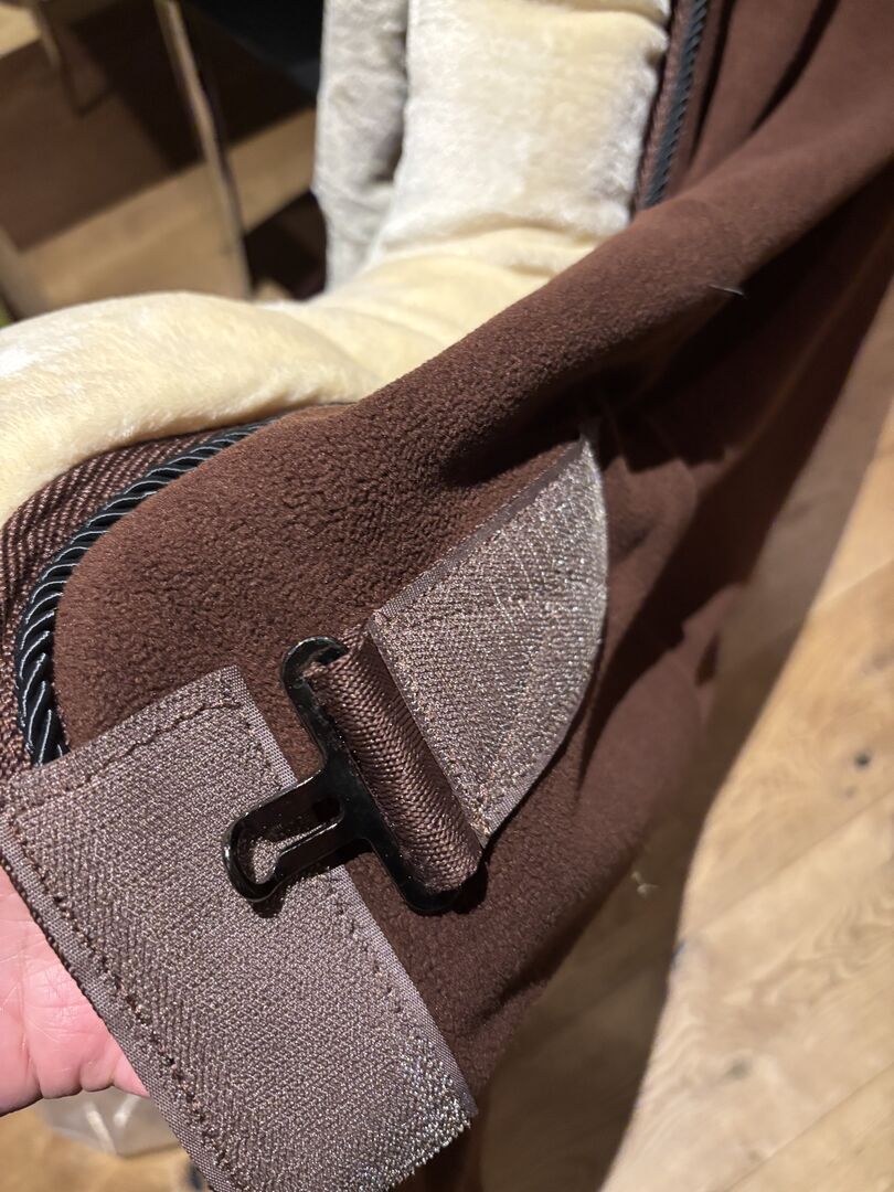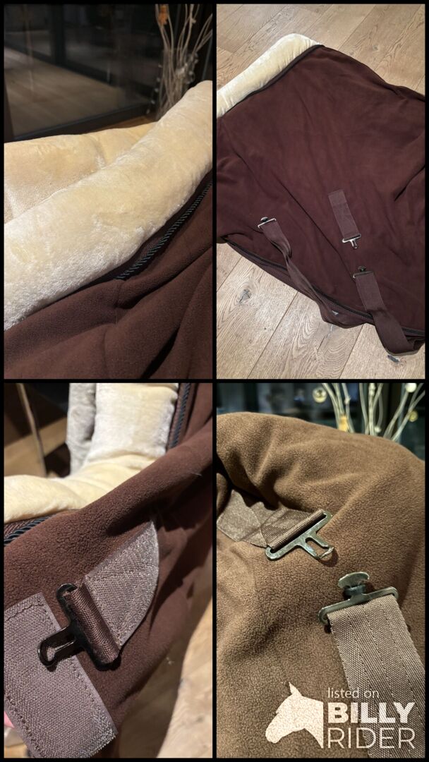 Svettmatta med pälskrage - Helt ny svettmatta i fleece med mysig pälskrage storlek 145 brun Stängning vid bröstet, korsade magremmar, svansögla Mega fin matta från RugBe by Covalliero Aldrig använd!
