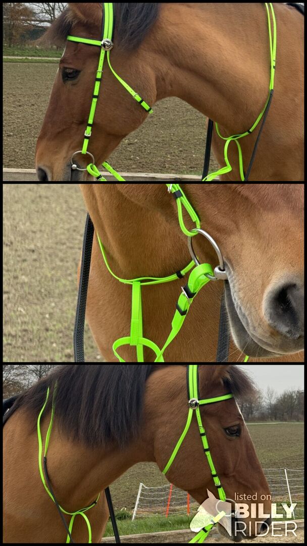 Syntetiskt träns NEON GREEN glänsande med martingal - Förstklassigt syntetiskt träns, glänsande neongrönt med martingal Glänsande Väderbeständig Med martingal Inklusive tyglar, delvis gummerade Förstklassigt syntetiskt träns för hästar, glänsande neongrönt med martingal, utan nosgrimma, inklusive tyglar. Tränset är delvis mjukt fodrat, mycket lättskött, väderbeständigt och lätt. Tyglarna är delvis gummerade. En produkt från märket Super Steeds.
