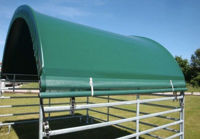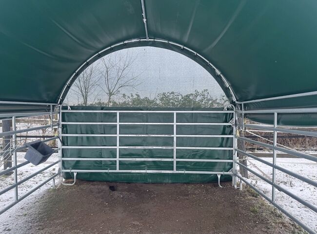 Den robusta metallramen garanterar hög stabilitet, medan den slitstarka, väderbeständiga lastbilspresenningen ger tillförlitligt skydd mot sol, regn och vind. Perfekt för beteshagar, paddockar eller hagar.