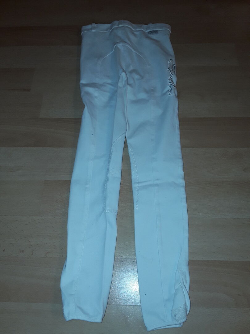 Tävlingsbyxor - Vita knäbyxor med vita knälapparna av tyg. Byxorna har en liten ficka med dragkedja på höger framsida. Stängning av benet: kardborreband Storlek: 164