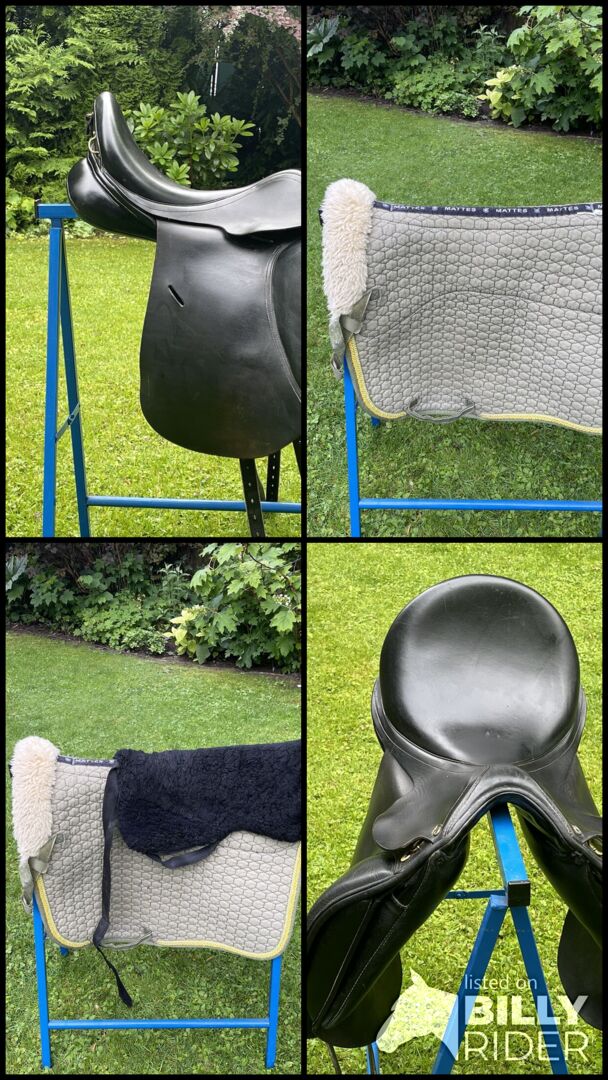 Tango dressyrsadel - Tango dressyrsadel med en bredd på ca 29 och god frihet vid axlarna. Den är nyligen vadderad. Den levereras med en sadelduk av lammskinn. Det nya värdet var 1450,- €.