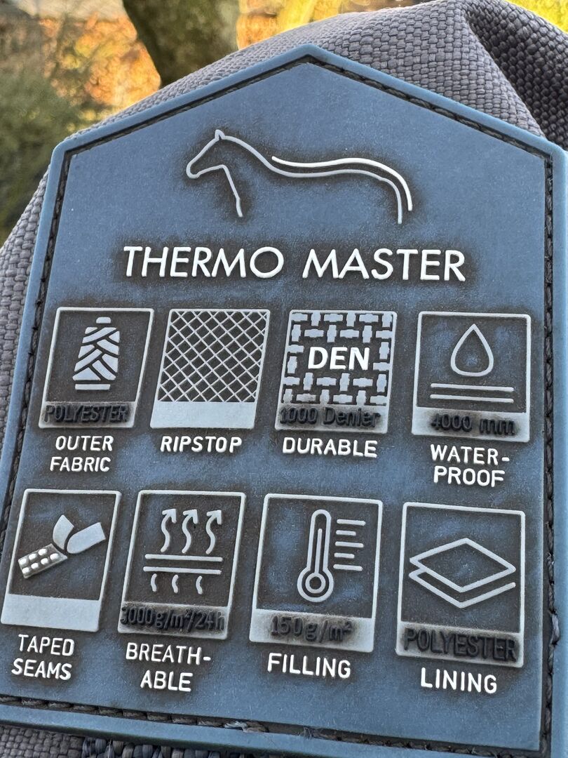 "Robust, vattentät och ventilerande utomhusmatta (vattenpelare 4.000 mm) tillverkad av rivtåligt 1.000 denier ripstop funktionsmaterial med värmande 150 g vaddering. Generös kil för optimal rörelsefrihet. Droppavvisande remsa i kontrasterande färg. Slätt, pälsvänligt innerfoder. Utrustad med dubbla T-krokar framtill, tvärgående surrningsband och justerbart svansband. Anordning för valfri fastsättning av benremmar finns. Finns som tillval med olika vadderingar. 100 % polyester."