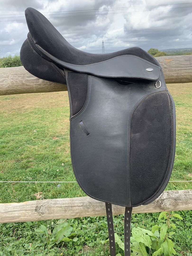 Lovely dressage saddle, synthetic , so very easy to wipe clean. Adjustable gullet so suits many horses, currently worn by an Irish sports horse.