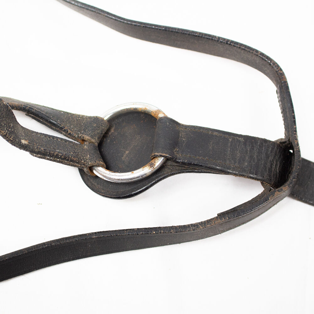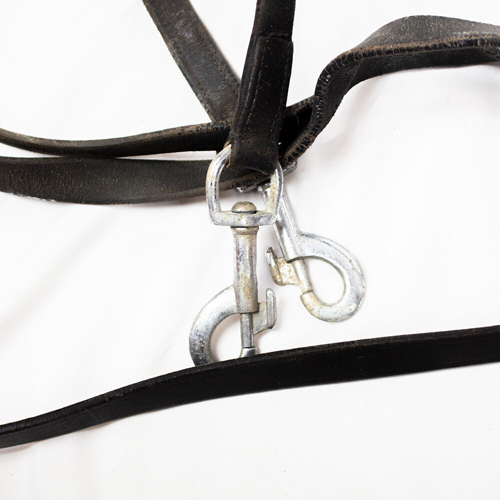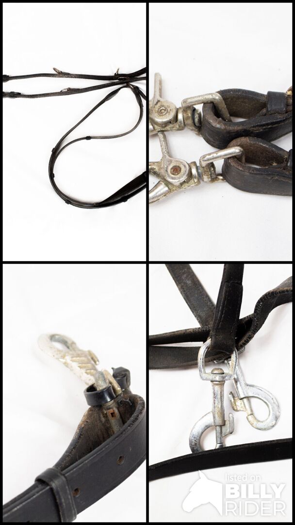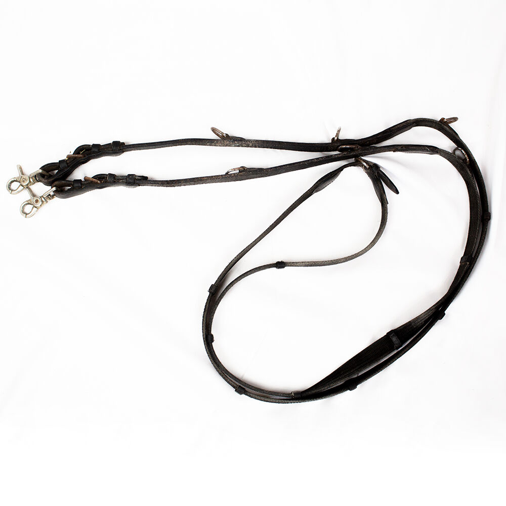 Tiedemann styr svart WB - Tiedemanns tyglar är ett praktiskt tillägg till arbetet med hästar och liknar mycket ögloräcken. Hjälptyglarna hör bara hemma i erfarna händer och är inte lämpliga för nybörjare! Tyglarna är av storlek warmblood. De har kraftiga tecken på användning och slitage på lädret, samt rost på beslagen. De fästes också med kabelband som kan tas bort.