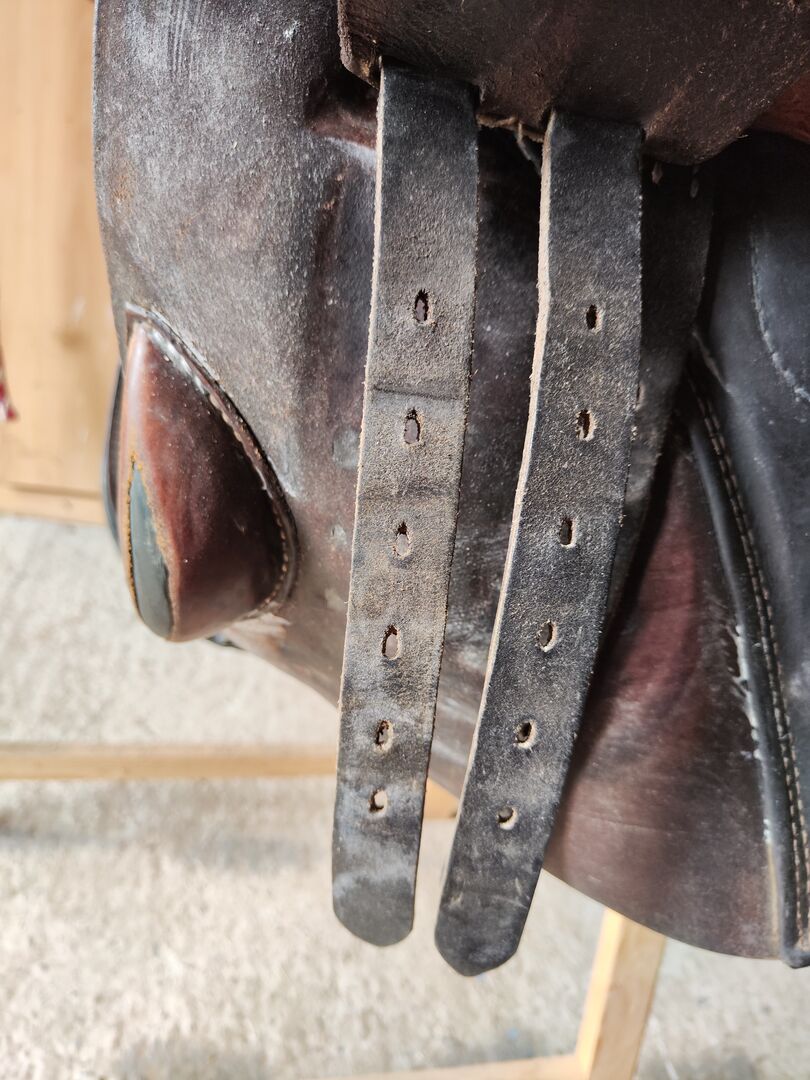 Till salu Stübben hoppsadel - Säljer en äldre hoppsadel från Stübben. Är en 17,5 tums sadel och svartbrun. Se bilder för skick. Jag har fotograferat allt