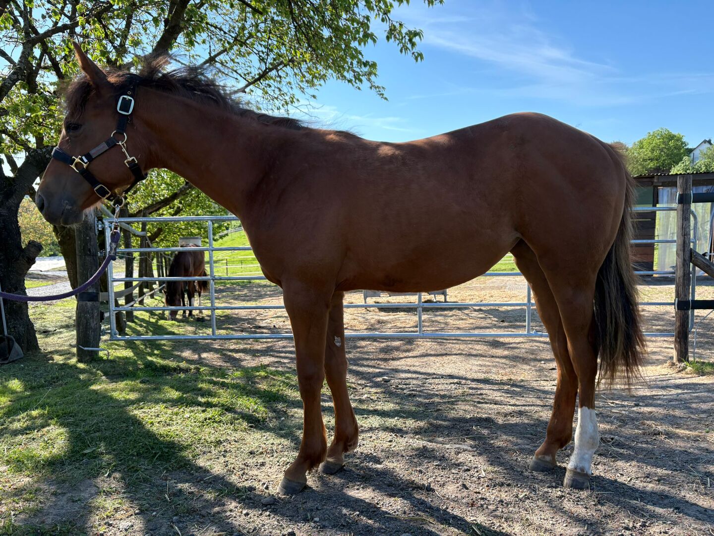 Topp dubbelt registrerat Quarter Horse ungt sto - Plats: 51399 Burscheid A Dream Of Mechanic - förstklassigt Quarter Horse-sto, född 3.24 med en beräknad sluthöjd på 160 till 163 cm, för användning i nöjes- / allroundarenan eller som en kärleksfull fritidskompis. Ellie är ett underbart ungt sto som inte bara imponerar med sin karaktär (söt, avslappnad, vänlig, tillitsfull), utan också med sin korrekta konformation, goda rörelser och förstklassiga stamtavla. Hon bor för närvarande med 3 ston i samma ålder i ett öppet stall. Stoet föds upp med det bästa kraft- och mineralfodret (Pavo Junior och Megabase), har hö och halm till sitt fria förfogande dygnet runt och gott om utrymme i det öppna stallet med angränsande äng för att få tillräckligt med motion. Hon har daglig kontakt med människor, kan ledas och skötas, vet hur man duschar benen och är bekant med alla fordon / arbete / ljud i det dagliga stalllivet plus byggarbetsplatsen vid stallet. Naturligtvis har hon avmaskats regelbundet, visats för hovslagaren och är redan vaccinerad mot influensa, stelkramp och herpes. Hon är registrerad för DQHA Futurity och EWU Young Horse Programme. Hon är 6-panel negativ genom sina föräldrar. Hennes far är en lovande unghingst efter den framgångsrikt visade Mechanic (världsmästare i Pleasure, Hight Paint Western Pleasure-hingst). Ellies mamma är avlad på Invitation Only/ Certain Potential. På grund av en minskning av besättningen letar detta fantastiska unga sto efter ett hem som kommer att stödja henne.