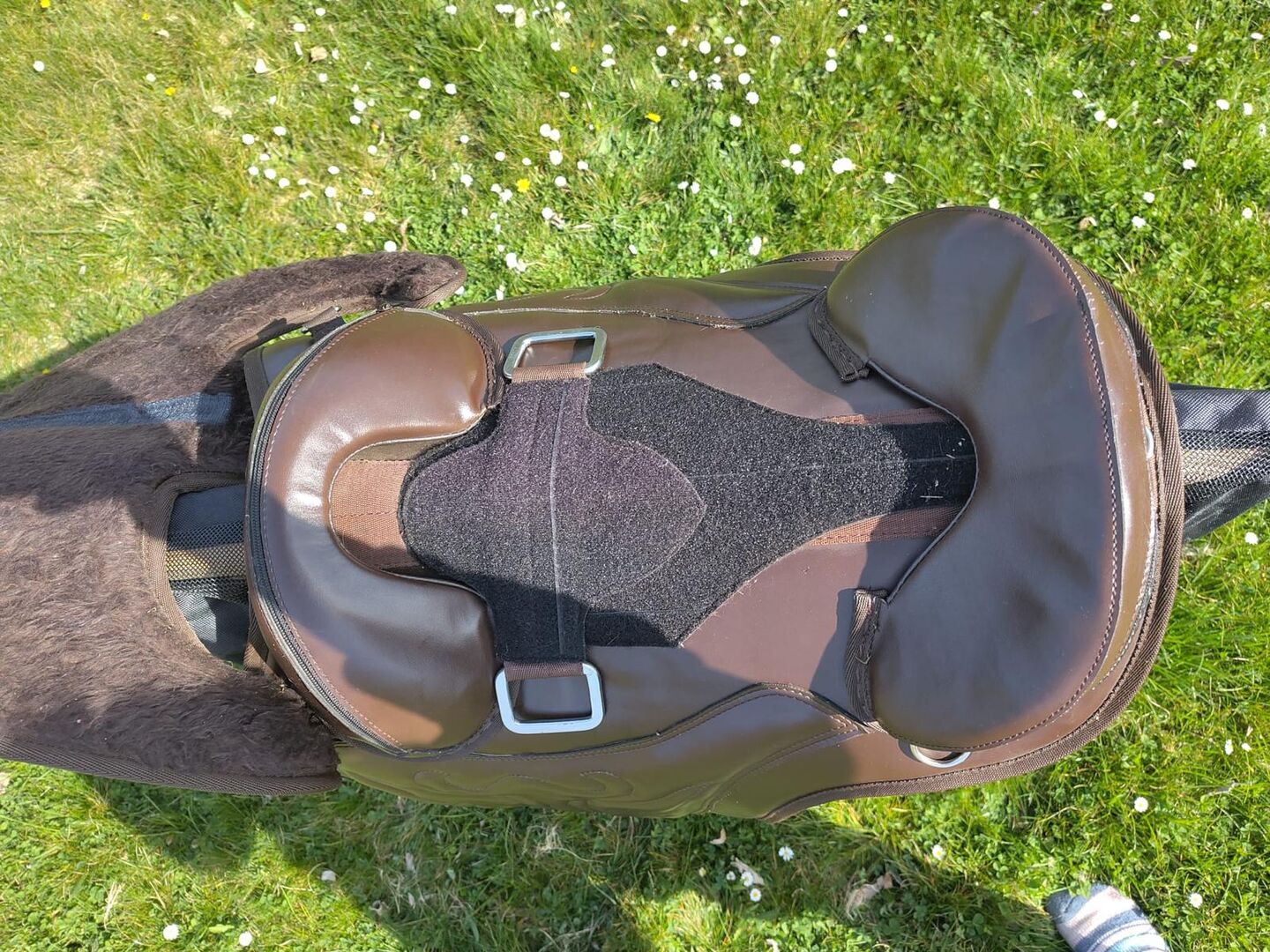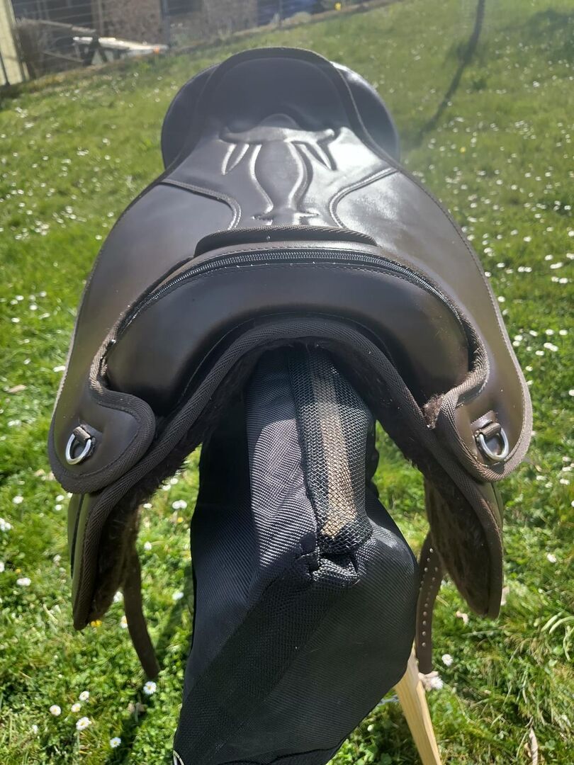 Trädlös sadel - -Nubuckläder i brunt. - Sadeln är flexibel och anpassar sig efter hästens rygg. - Den har paneler med kardborreband och kräver ingen särskild pad. - Stigbygelplattan och den bakre pallen är avtagbara. - Sadeln är lätt och väger ca 4 kg. -17 tum -NEW - har provats på hästen två gånger