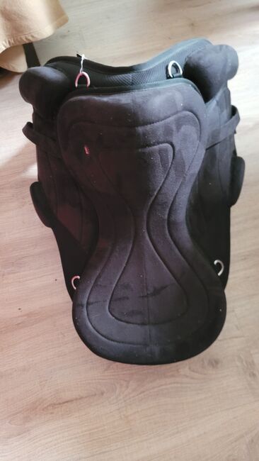 Trädlös sadel HKM 18" - Till salu en trädlös svart syntetisk sadel från HKM, 18" inklusive sadelgjord och stigbygelskinn, NY. Teddy fleece på undersidan.