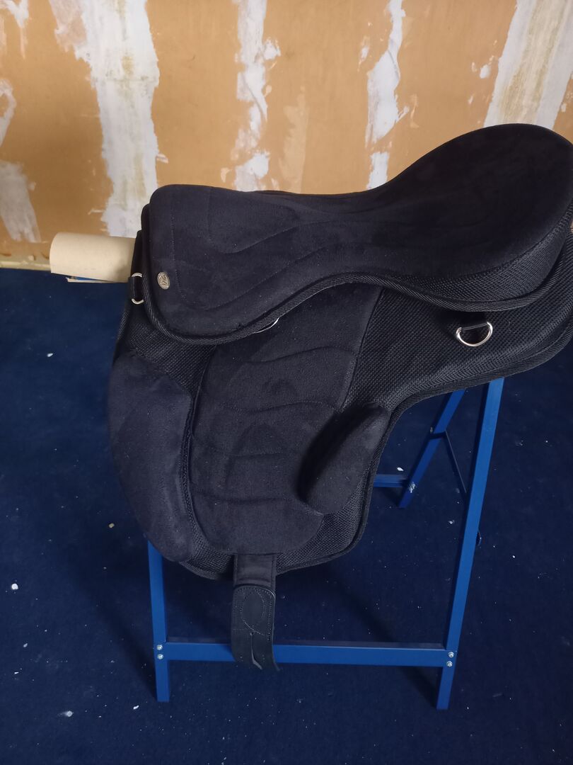 Trädlös sadel HKM - trädlös svart syntetisk sadel av märket HKM storlek 18 inklusive 60 cm sadelgjord och stigläder, som ny. Öppet fäste för stigbygelrem. Teddyfleece på undersidan, inspektion möjlig på plats