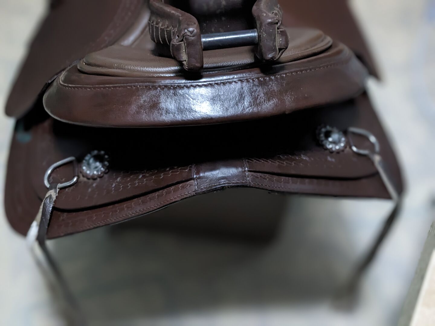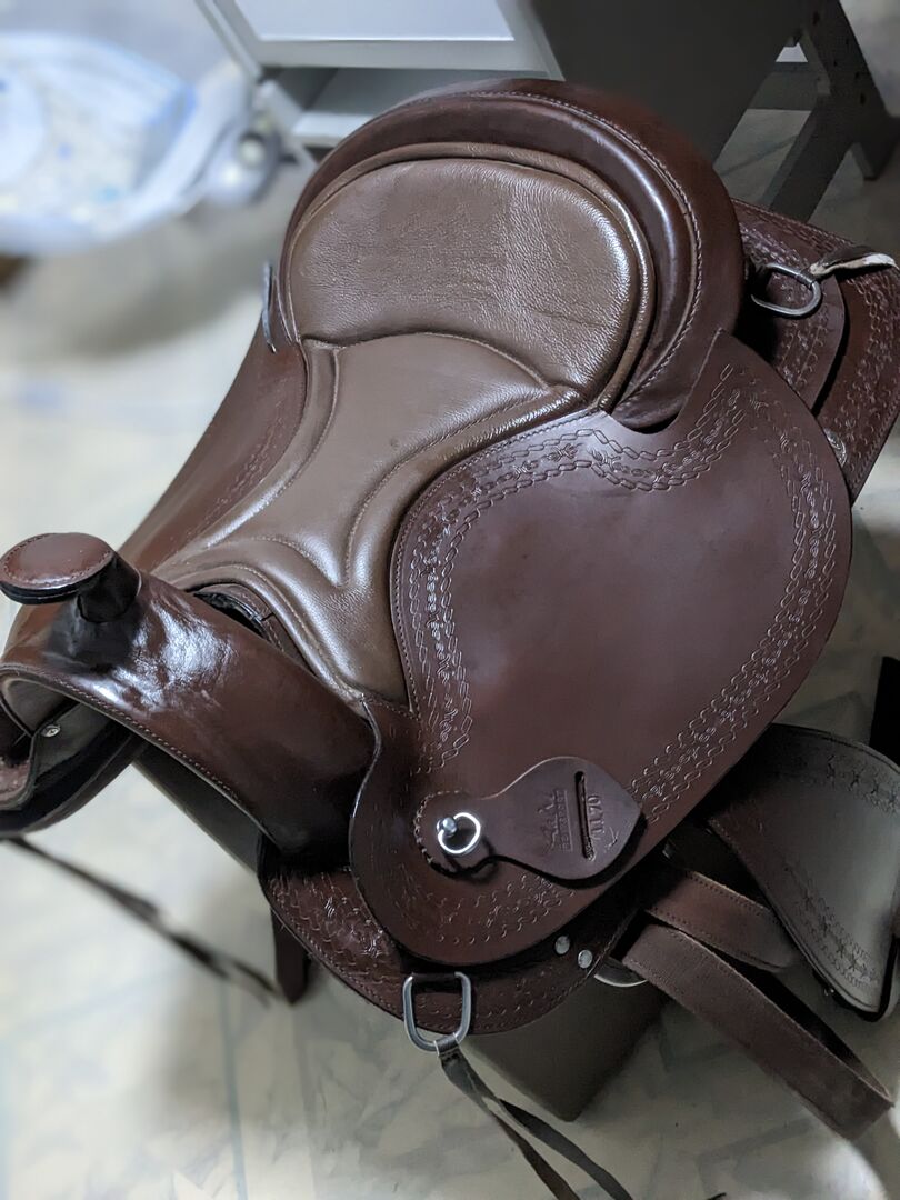 Trädlös västlig sadel kallt blod - Westernsadeln är nästan ny, knappt några tecken på användning, 17 tums sits, tänkbar för mycket breda quarter, Hafi, Tinker, litet kallblod. Jag kommer också att lägga till en ny omkrets. Vacker stämpling antingen i 26 tum eller 28 tum.