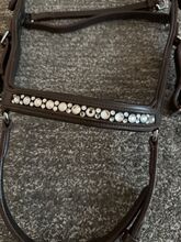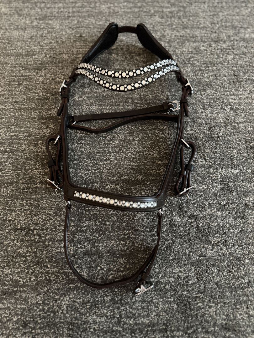 Träns anatomiskt isländskt brunt - Till salu här ett knappt använt anatomiskt träns för islandshästar i brunt med glitterstjärnor.