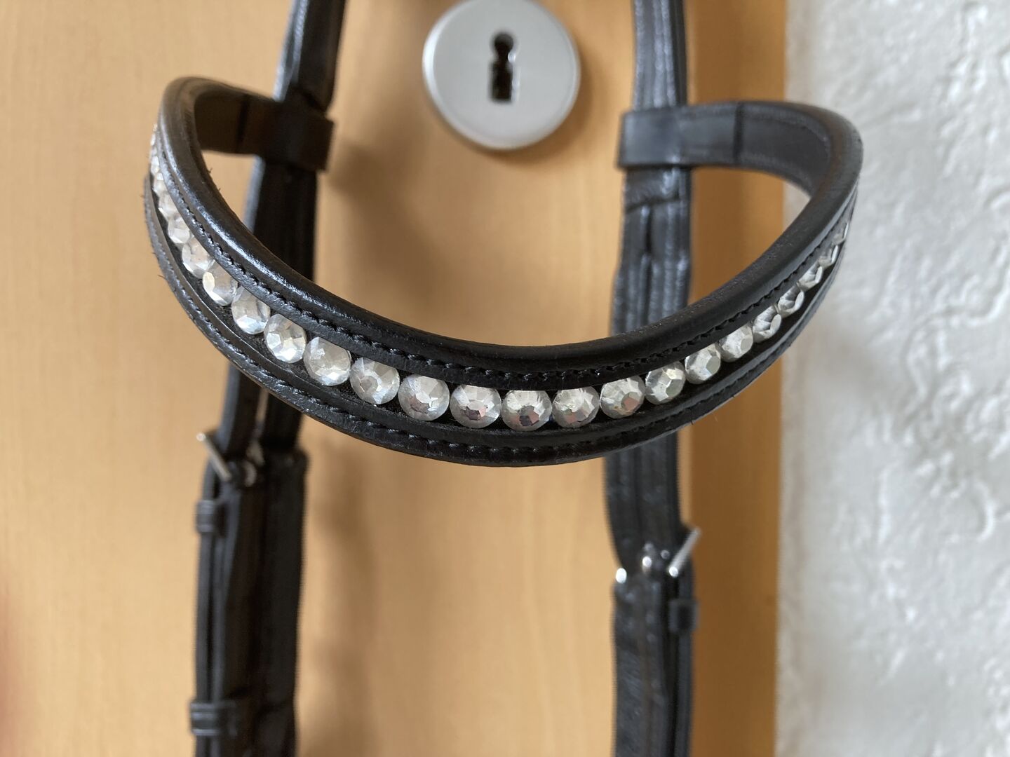rundat och extra mjukt vadderat delat huvudstycke, som tar hänsyn till det begränsade utrymmet bakom öronen upphöjd, individuellt längdjusterbar huvuddel för optimal tryckfördelning och tryckreducering på ryggkotorna tillverkad av mjukt läder med nyloninlägg, vilket gör den särskilt smidig, mjuk och lätt medvetet utan halslås för att minska extravikten Caveson kan spännas på båda sidor Böjt pannband med strass med tränsbygel, beslag i rostfritt stål inklusive tyglar av mjukt läder, med dubbelt antal läderstänger och extra korta avstånd för optimalt grepp vid mycket varierande tygelstorlek, med martingalskenor LPO-kompatibel