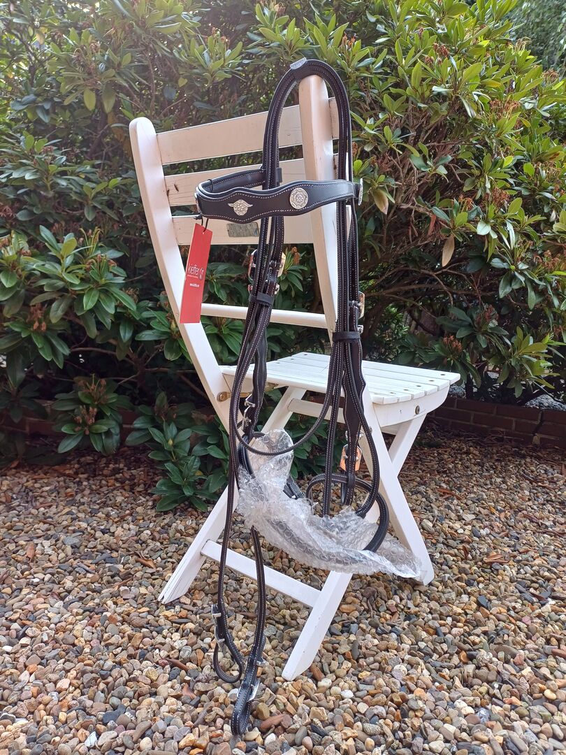 Jag säljer mitt oanvända svartvita träns Isabella by Kieffer med läder tyglar, fortfarande med prislappen.