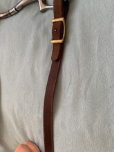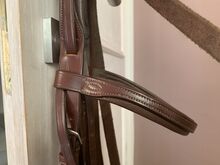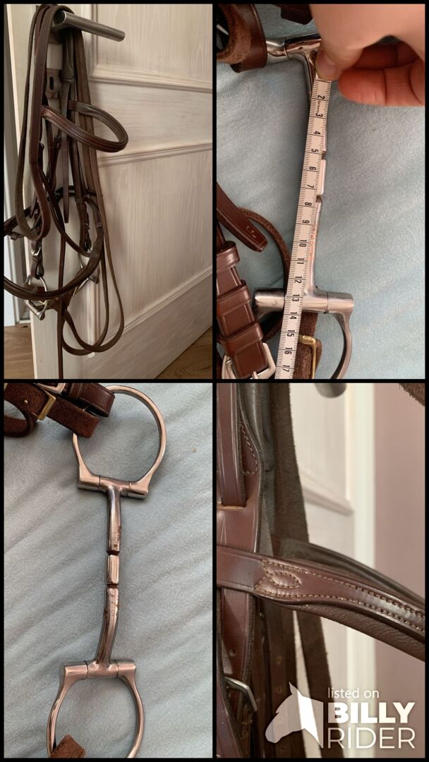 Träns med tyglar och bett - Till salu här är ett mörkbrunt läderhuvudstall för hästar för varmblodiga hästar. mjukt läder, välskött
