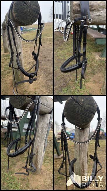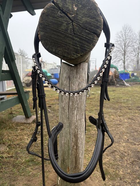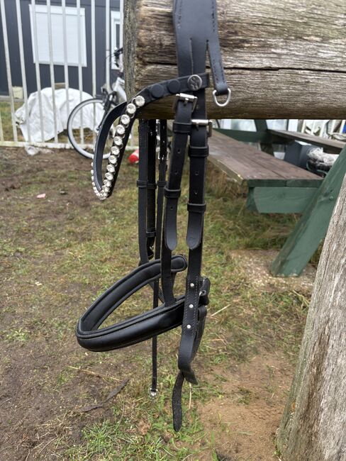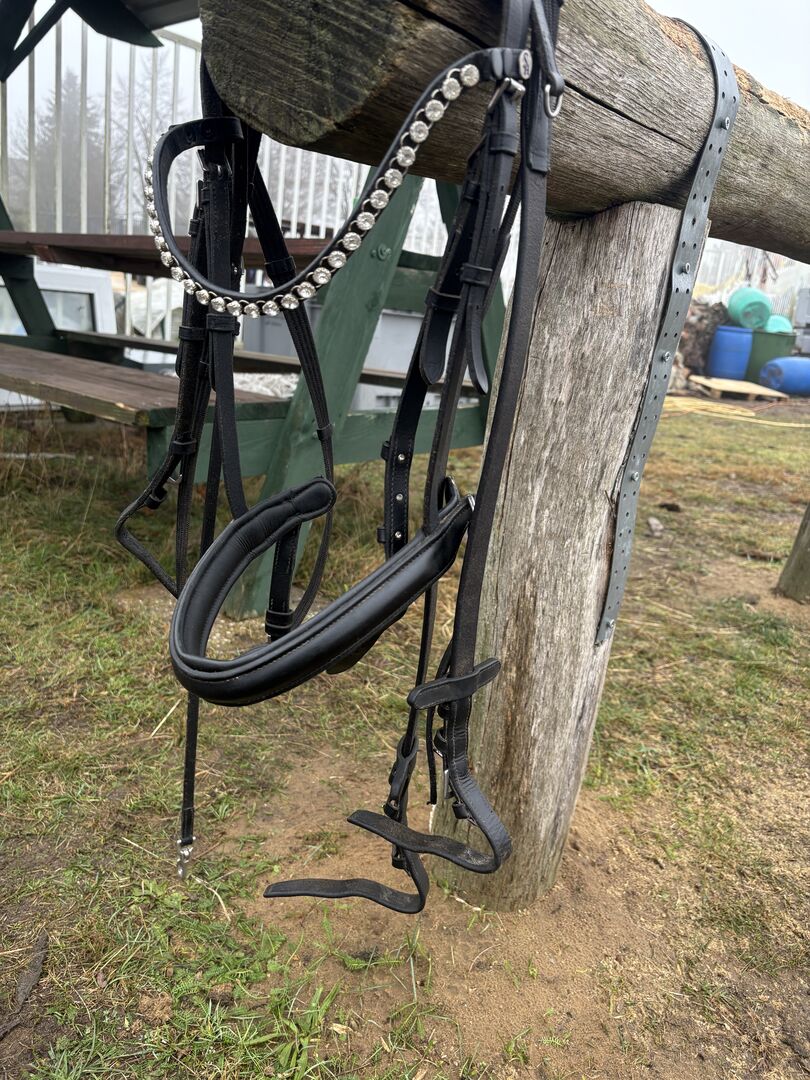 Träns/svart/brass/ WB med pannbandsbygel/med tyglar - Träns från Fouganza med SHOWMASTER Pannband Change Fast Diamond (så gott som nytt), begagnat men inga skador. Även begagnade tyglar, även de från Krämer. Det är värt att köpa mer