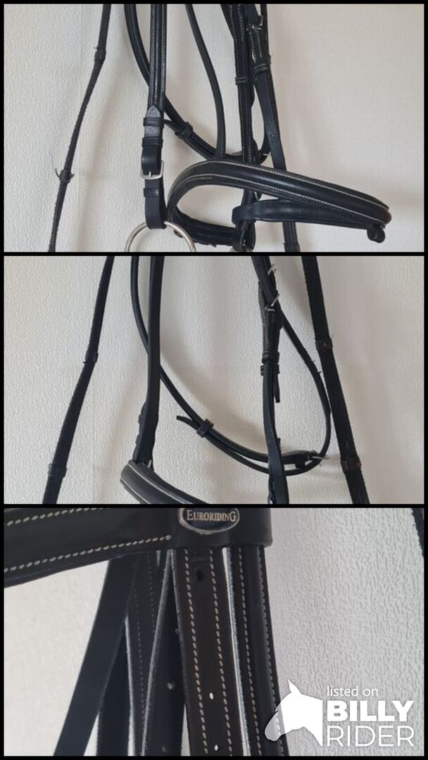 Träns/tränsbygel - Jag säljer en enkel engelsk träns, utan spärrband. Storlek Cob/VB, i svart med vita sömmar av Euroriding. Den är gjord av mjukt läder utan många krusiduller. Den är nyligen rengjord och smord. Bett och tyglar kan lämnas kvar gratis om så önskas. Bitens längd: 16,5 cm. Längd på tyglarna på varje sida ca 140cm. Frakt möjlig.