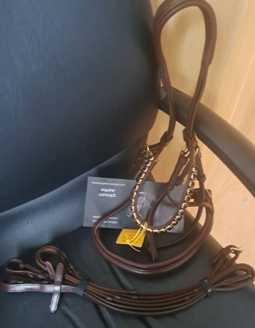 Träns + tyglar - Vackert rundsytt, mörkbrunt träns med matchande tyglar till ditt varmblod (fullblod). Absolut lika bra som nytt, aldrig använt. Var avsedd som en gåva.