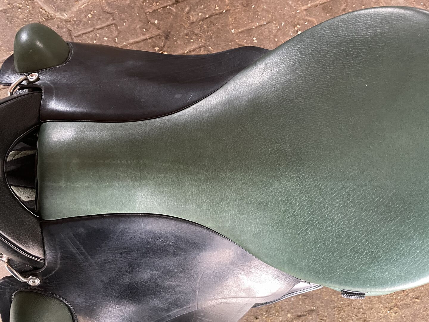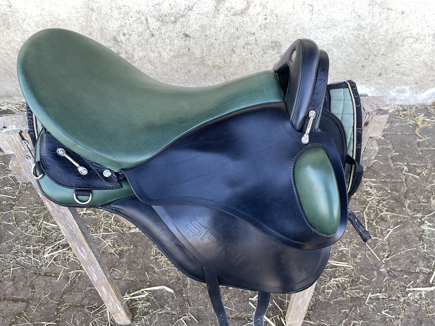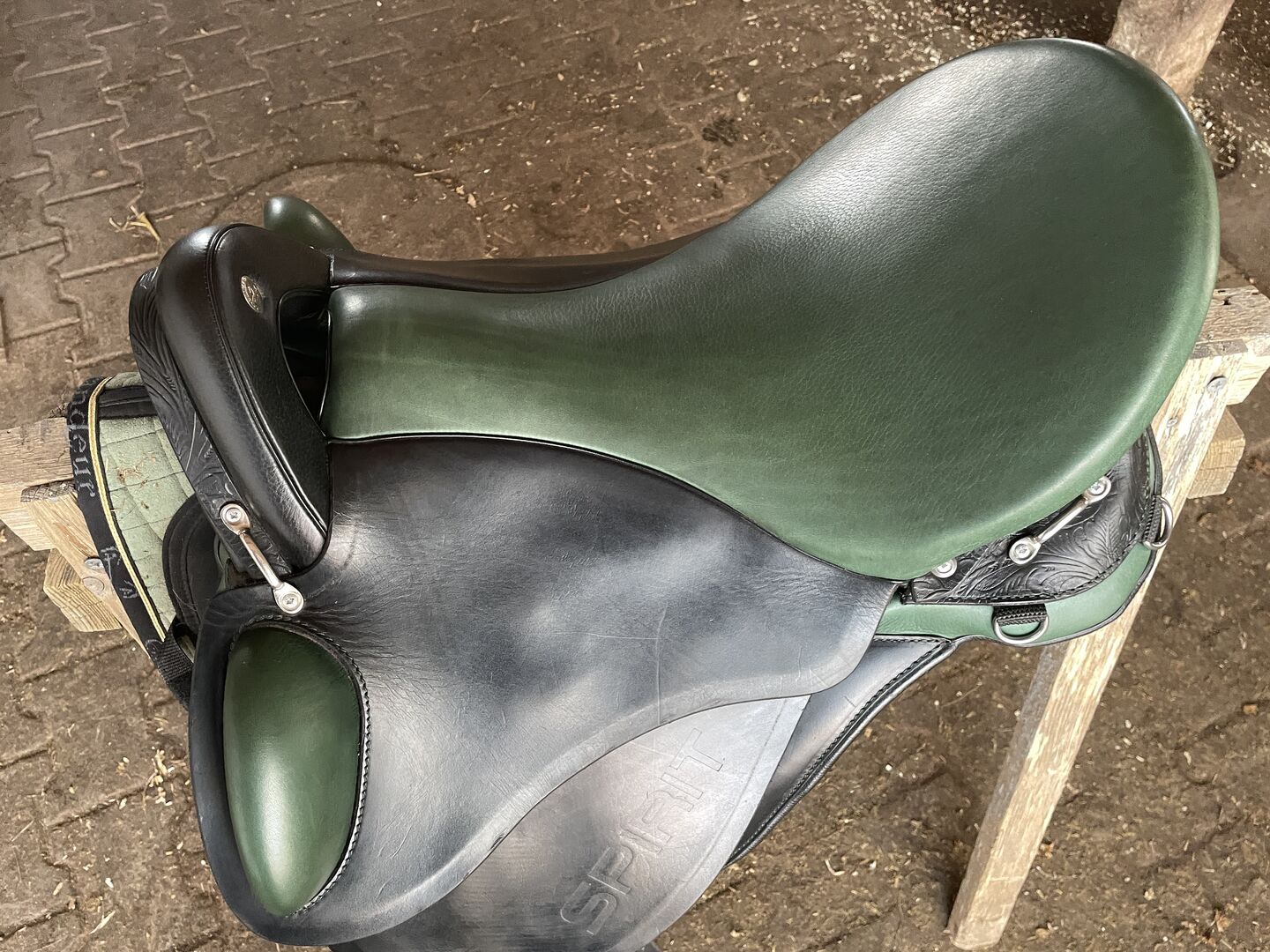 Professionell sadel för distans- och terrängritt Helt flexibelt träd av plast med sadelgjutning - med sadelgjord Skyddande trekkingpaneler Sadelstorlek 18 Bygelbredd 31, kan justeras steglöst Kontaktyta: ca 2000²cm Särskilda egenskaper: mycket lätta uthållighetspaneler, påsatta pommels Dynans längd: ca 49 cm Färg svart - specialfärg grön Beslag i silver Ryskt läder Rörlig sits
