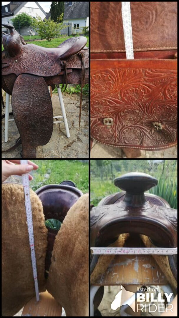 Trail Riding Saddle Western Saddle Arabian 16" med sadelväskor - Jag säljer denna vackra handgjorda western-sadel med matchande väskor! Tyvärr har jag inte rätt häst för sadeln eftersom vi har bytt till engelska. Sadeln har använts mycket och är fortfarande mycket bekväm. Naturligtvis har den motsvarande tecken på ålder och användning. Ändå är den fortfarande ett absolut blickfång med sin prägling och fickorna! Sadeln säljs utan grimma och stigbyglar. Information om kanten: -Semi Quarter tree -Hög skryningshöjd frihet -Lämplig för branta axlar -Medium swing -61cm total längd -Kammarens bredd 18cm -Blommor med verktyg förskönade -Med tillbehör för trailridning Den är mer lämplig för smala hästar (arabiska, arabisk blandning, trakehner etc.) men måtten kan ses på bilderna.
