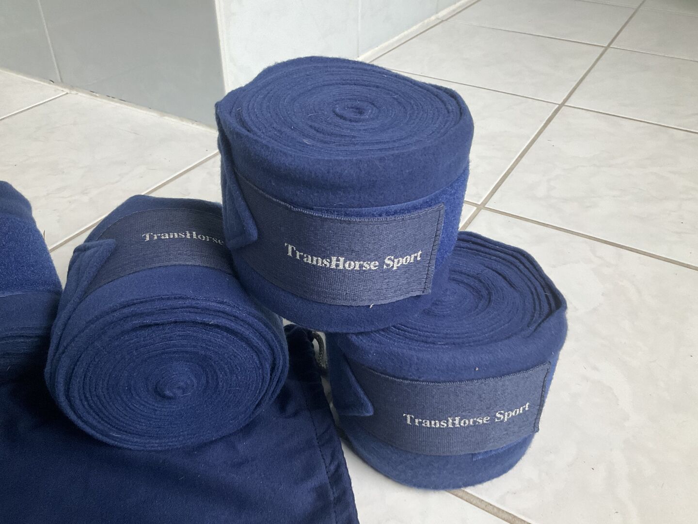 TransHorse 4 blå bandage, toppskick - Jag säljer 4 vackra mörkblå bandage från det populära märket TransHorse inklusive påse. De är i toppskick och nästan aldrig använda då jag föredrar att använda damasker.