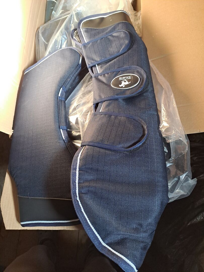 Transportskydd NEW Cob Set med 4 st. - Säljer nya transportstövlar i storlek Cob (hästar 150 - 165 cm stm). Färg: marinblå. Jag har aldrig använt dem, förpackningen har bara öppnats för inspektion. Ursprungspriset var 65 €, jag skulle vilja ha 40 € för dem. Frakt möjlig, kostnader extra.