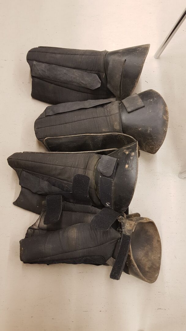 Transportskydd WB - Jag säljer 1 uppsättning begagnade, mycket robusta transportstövlar storlek WB. Vadderat bomullstyg med starkt läderskydd för kronan, hoven och trampdynorna, samt för insidan av benen.