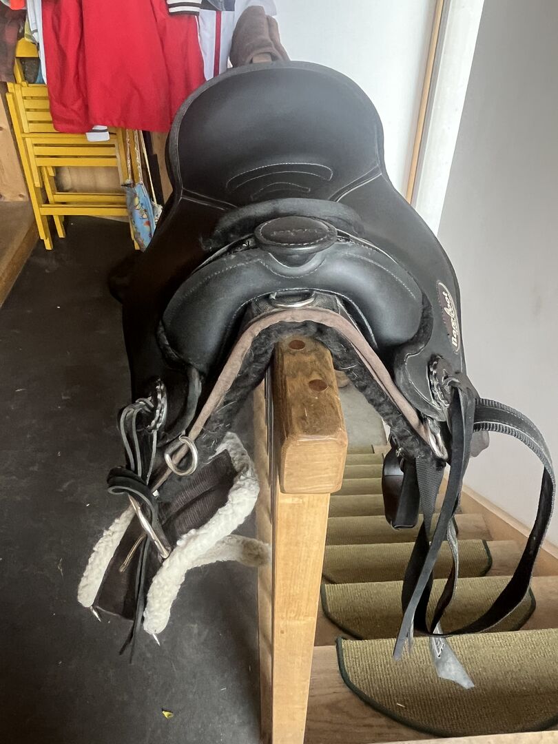 Treeless barnsadel Ponnysadel Barefood Complete - som ny trädlös sadel, utbytbar gaffel därför justerbar till nästan alla ponnyer, hästar. Har endast använts ett fåtal gånger. inkl. sadelunderlag från Barefood och sadelgjord. kan skickas