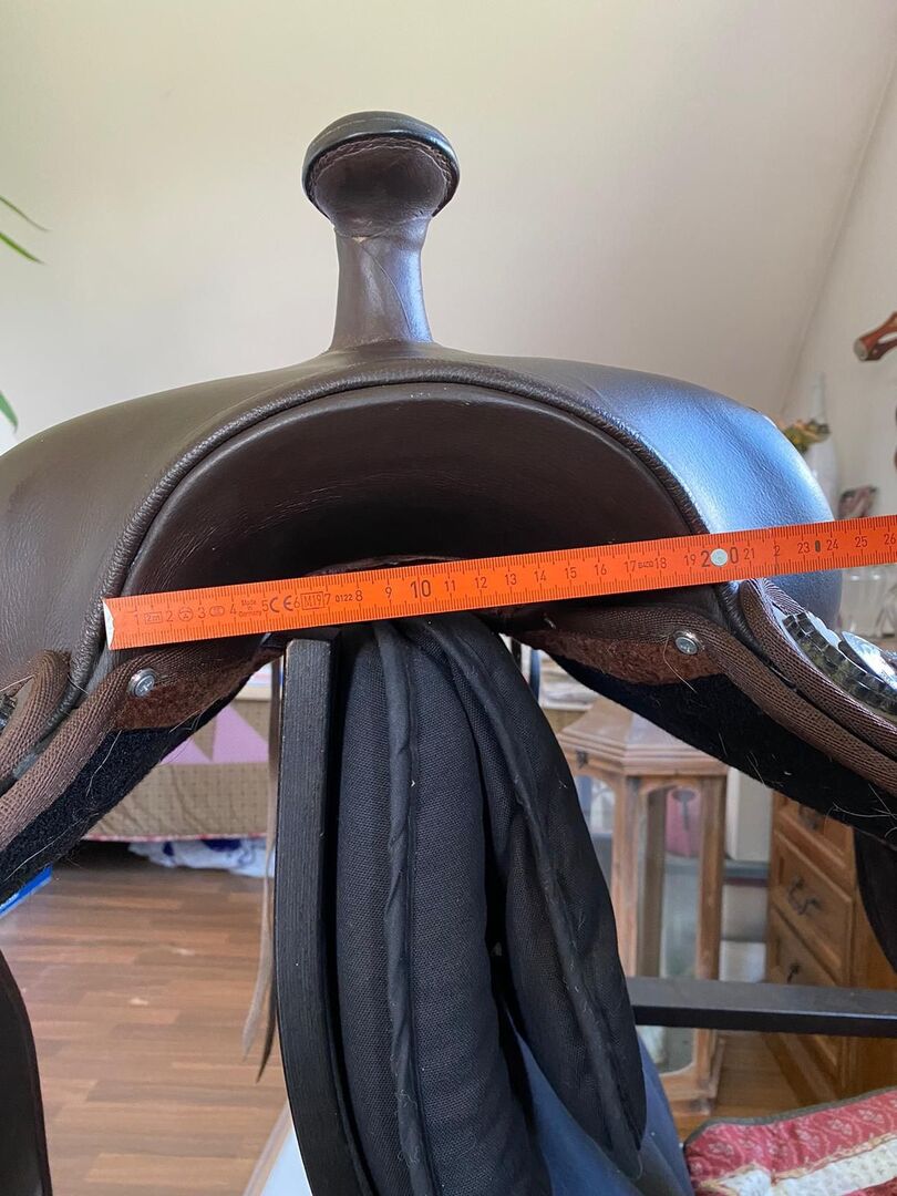 Treeless Western Saddle - Säljer en trädlös westernsadel från A&M Reitsport. Har sällan varit på hästen på grund av ryggproblem. Ej äkta läder. Färg brun. Sitter mycket bekvämt. Tyvärr saknas en stor concho (se bild). Sadeln levereras med ett sadelskydd och en gelpad om det behövs. Om du har några frågor, vänligen skicka mig en PN :)