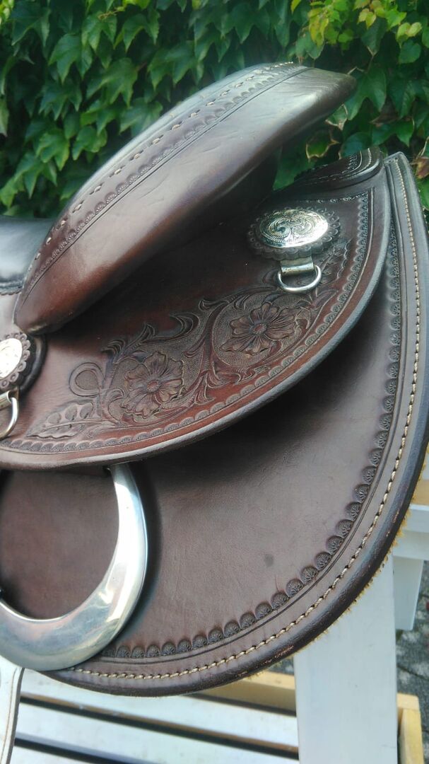 Triple W westernsadel, knappt använd, blommor i chokladbrunt - Mycket fin, knappt använd westernsadel i chokladbrunt med blomsterprägling. Total längd ca. 64cm Bredd mellan conchas ca. 27/27,5cm