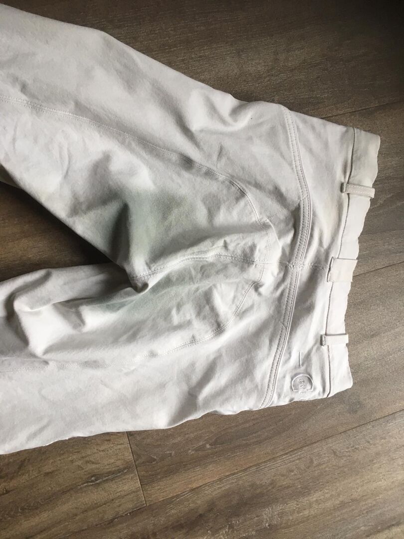 Jag säljer ett par vita tävlingsbyxor. Byxorna har ett bra knägrepp. Storlek S