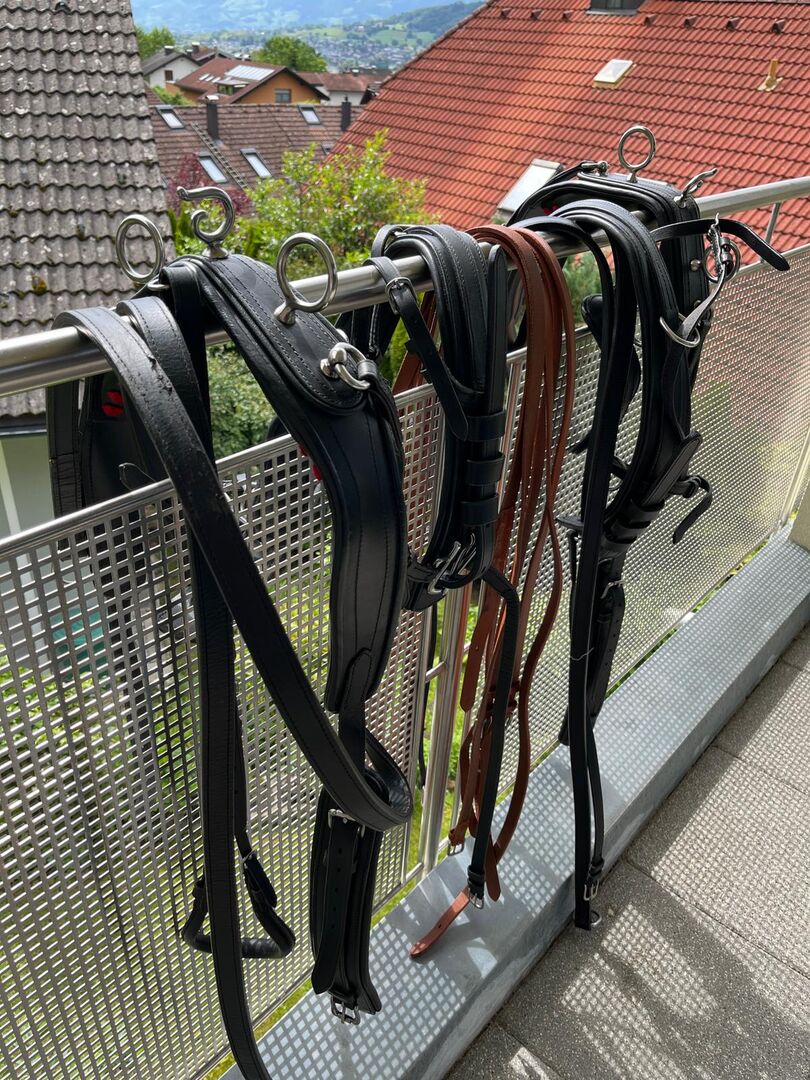 Två-i-hand bröstplatta sele för ponnyer Stckm. ca 1,20m - Jag säljer min sällan använda tvåhästs bröstkorgssele för ponnyer med en höjd på ca 1,20 meter. Mindre slitage, i övrigt i mycket gott skick. Jag säljer den med koppel, men utan huvudbonaderna! Jag köpte den i januari 2023 på Kutschen Kibele i Meckenbeuren.