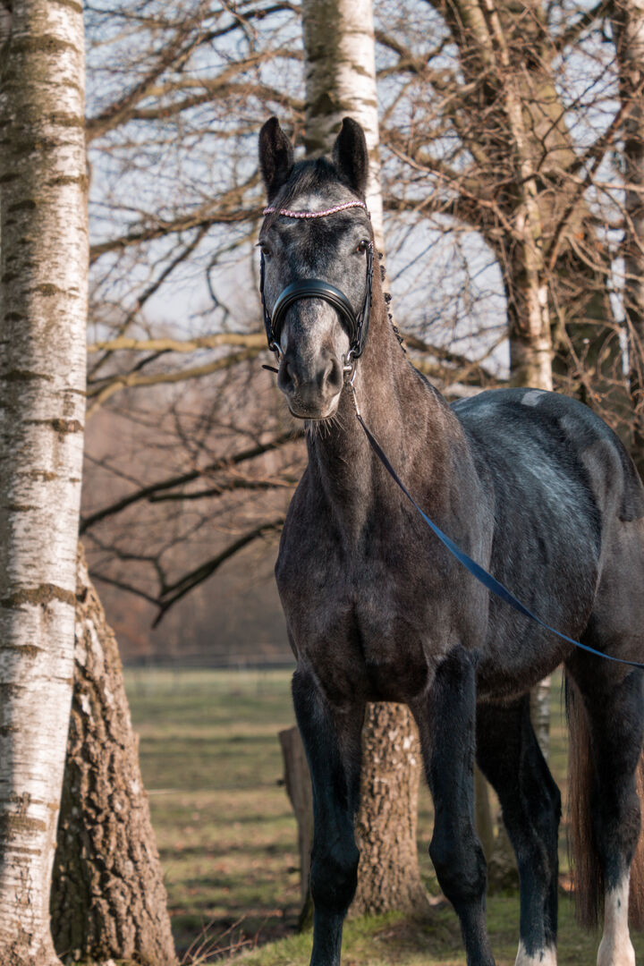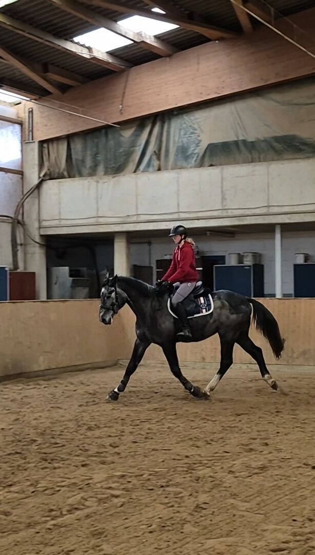 Även när han tränar utanför hemmet är han alltid fokuserad. Att rida ut ensam eller med andra är inget problem. Han känner till barn, traktorer och allt annat som en ung häst behöver känna till. Han är tränad efter sin ålder och har redan gjort ett eller två små hopp. Efter att ha blivit inriden hade han en paus på ängen, men han måste ha blivit sparkad där och vi var tvungna att få honom injicerad i isg. För närvarande pressas han igen och är i muskelutveckling, varför repetitioner inte är möjliga för tillfället. Tyvärr har han en liten hovbensdeformitet baktill, varför vi bara säljer honom som fritidshäst. Detta påverkar dock inte honom.
