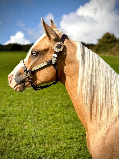Unghingst i en klass för sig: Palomino Quarter Horse-hingst med framtidsutsikter - Plats: 34396 Liebenau Mobsters Smart Gun - en ung Quarter Horse-hingst i den speciella Palomino-färgen med två blå ögon, född den 24.05.2023. Han är ett absolut blickfång med sin korrekta, kompakta och starka byggnad och mycket bra muskulatur. Hans nuvarande höjd är 141 cm, hans slutliga höjd kommer att vara cirka 145 cm. Han kommer att växa upp i en besättning med hingstar och valacker och är bekant med både öppen uppstallning och bete. Hingsten är frisk, har genomgått en stor allmän undersökning med 18 röntgenbilder, är 6-panel n/n, regelbundet vaccinerad och avmaskad och är van vid veterinär och hovslagare. Hans karaktär är extremt söt, tillgiven, människoorienterad och gosig, samtidigt mycket tillitsfull, avslappnad och orädd. Trots sitt lugn är han känslig, lyhörd och fin att hantera och verkar inte alls avtrubbad. Han hanteras regelbundet, är väluppfostrad och okomplicerad, kan föl 1×1, är haltertränad och går på släpvagnen utan problem. Hans marktäckande gångarter och hans förstklassiga reiningstamtavla (HF Mobster x Gunnatrashya) gör honom till en lovande unghäst som kommer att imponera både i tävlingsringen och på fritidsarenan. Med sin potential och gyllene karaktär är den här unghästen ett riktigt framtidslöfte. Han är NRHA-registrerad och har livförsäkring (permanent invaliditet ingår), som kan tas över om så önskas.