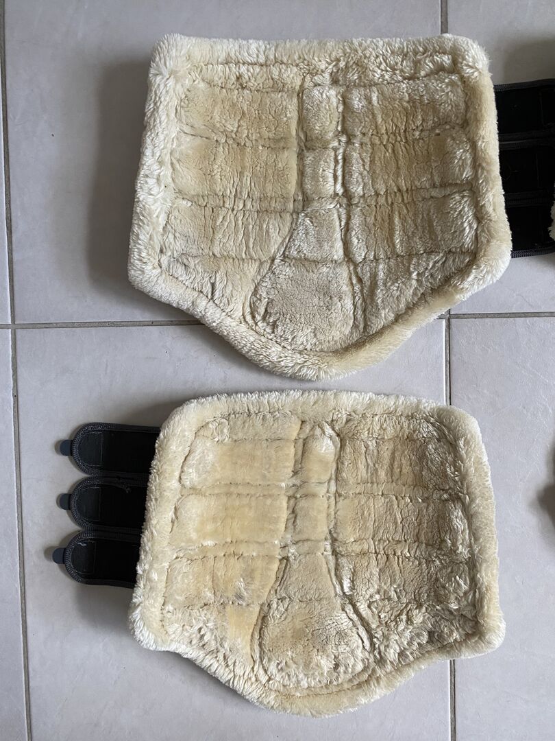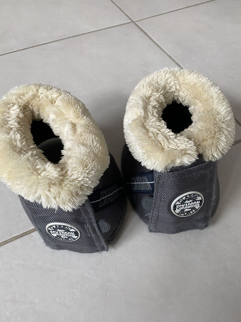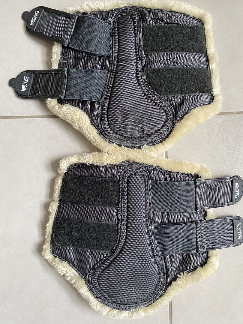 Uppsättning med 4 Eskadron-västar plus klockor - Jag erbjuder ett set med 4 st Eskadron damasker (2x M för fram och 2x L för bak) och ett par matchande klockor i XL. Damaskerna är i toppskick (se bilder) och det är även klockorna. Sömmen på en klocka är ca 2 cm öppen. Alla kardborrefästen och pälsen är fortfarande supermjuka och fluffiga.