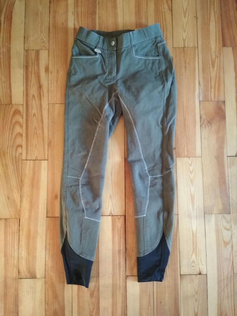 USG ridbyxor (storlek 36) i khaki/olive med full sits och elastiska benslut - Vackra byxor som tyvärr inte passar mig ordentligt. Jag hade dem på mig två gånger under ridning och märkte att de inte passar mig ordentligt. Färg: Khaki eller oliv med vita sömmar. Storlek: Storlek 36 - passar smal Skick: Toppskick, endast vid knäet har en liten söm längs kanten öppnat sig, kan sys ihop. Material: 60 % bomull, 32 % nylon, 8 % elastan.