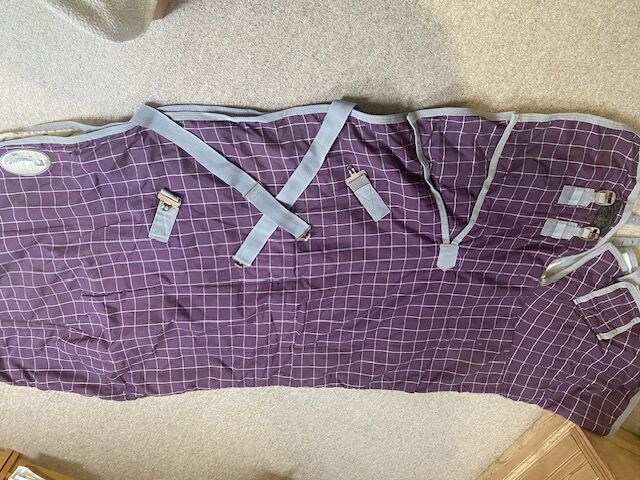 Nice purple checked rug. Has leg straps. Clean but with some staining on inside lining. All straps buckles in good order