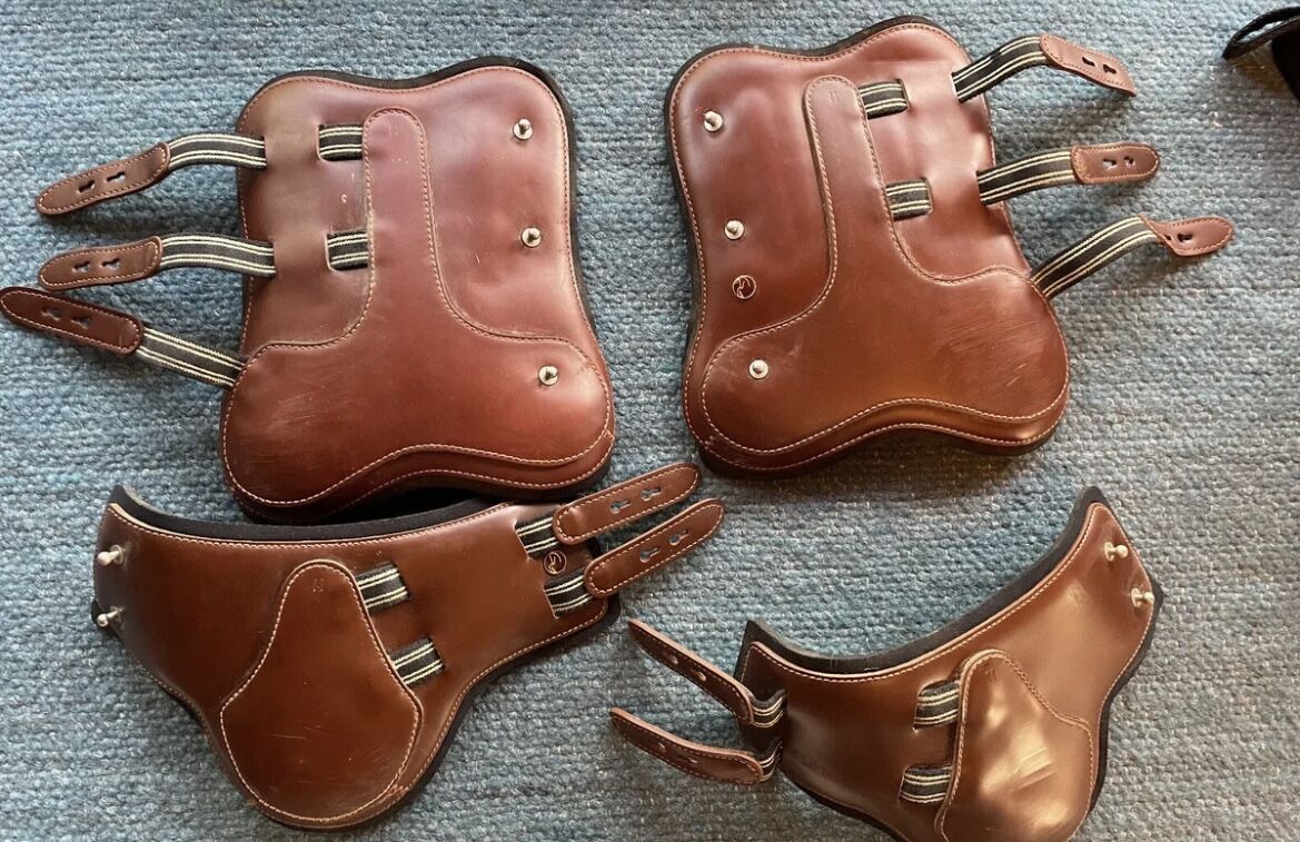 Utrustning för turneringar - På grund av att jag ger upp ridning säljer jag mina saker. De är i bra skick, särskilt de bruna gamacherna, transportgamacherna och främre selen är i toppskick. Det finns hästhår på insidan av spatsarna, men de har tvättats och är helt fina. Ett foto visar hela saken på hästen. Vi vet alla vad dessa saker kostar, så varför inte köpa billigt begagnat? Ha det så kul!