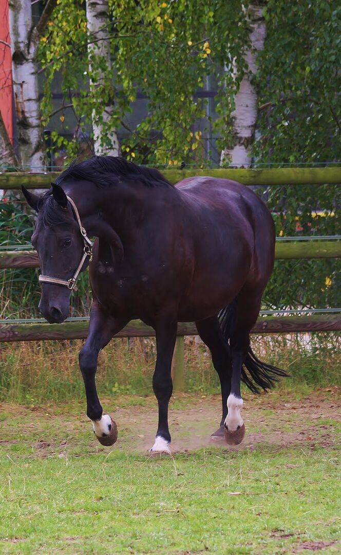 Vacker svart och rödbrun avelssto med den bästa dressyrstamtavlan - Oldenburg svart sto 2007 efter Ron Rubin/Diamond Hit/Rohdiamant/Pik Bube (Cadarina linjen) Stoet har hittills fått 5 förstklassiga föl och producerar alltid föl med mycket starka rörelser och härliga föl. Alla var av mästerskapskvalitet. Videor kan skickas på begäran. Som föl var stoet själv också ett mästerskaps föl för Linen German Foal Championships. Senare riden upp till dressyrhästar på nybörjarnivå. Storebror till stoet var segerrik upp till avancerad (S*) nivå. Från mormodern kommer den licensierade Dorado H efter Davignon I. Davignon I och från en syster till henne Randale av Rubinstein den godkända hingsten Edinburgh av Abelendreff och statspremierade ston. Fadern Ron Rubin, kommer från en av de bästa dressyrlinjerna (Finnländerinlinjen) och hans mor är helsyster till Don Schufro. Diamond Hit, framgångsrik upp till OS-nominering, och Rohdiamant, en stjärnhingst inom dressyrhästaveln, gör denna stamtavla mycket intressant. Hennes blod är därför förmodligen ett av de viktigaste för en avelskarriär. 2 x inavlad till Rohdiamant och 2x till Pik Bube samt helsyster till Don Schufro och Don Schufro själv gör hennes stamtavla till en mycket speciell höjdpunkt. Stoet är absolut kompatibelt med flockar och väluppfostrat. Hon har bara en liten brist som inte påverkar henne för avel. Plockar upp mycket lätt och alla födslar var problemfria. Hon är också härlig att hantera och därför idealisk för nybörjare. Hade även ett drömföl efter Viva Gold 2023 ej inseminerad för 2024. To the seller's offerlaunch