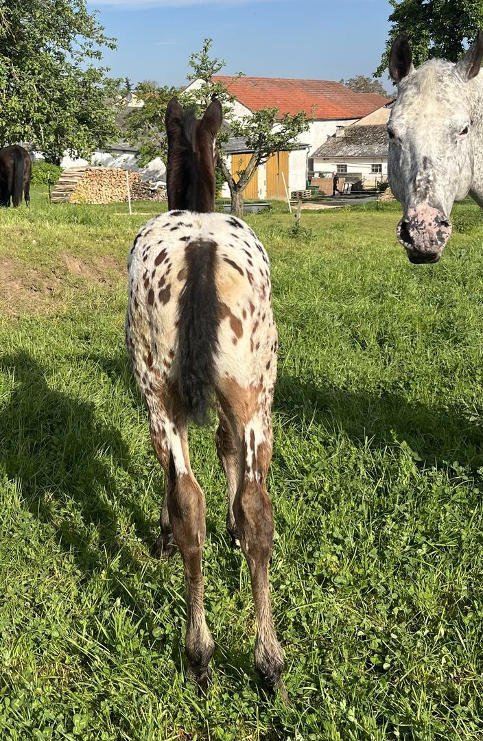 Vackert Appaloosa-sto - Den vackra "Lady of Montana" letar efter ett nytt hem. Hon har vackra markeringar och korrekta lemmar. Montana har en livlig gång och är mycket människovänlig. Alla hennes syskon har fått utmärkelser av APHCG. Hennes bror från 2023 var LG1 Champion Foal med en poäng på 9,3. Hon är mycket intressant för avel och sport. Hennes far är vår Ima Sioux Olena, mor: Roxys Lady in Dark. Vi ser fram emot ert besök.