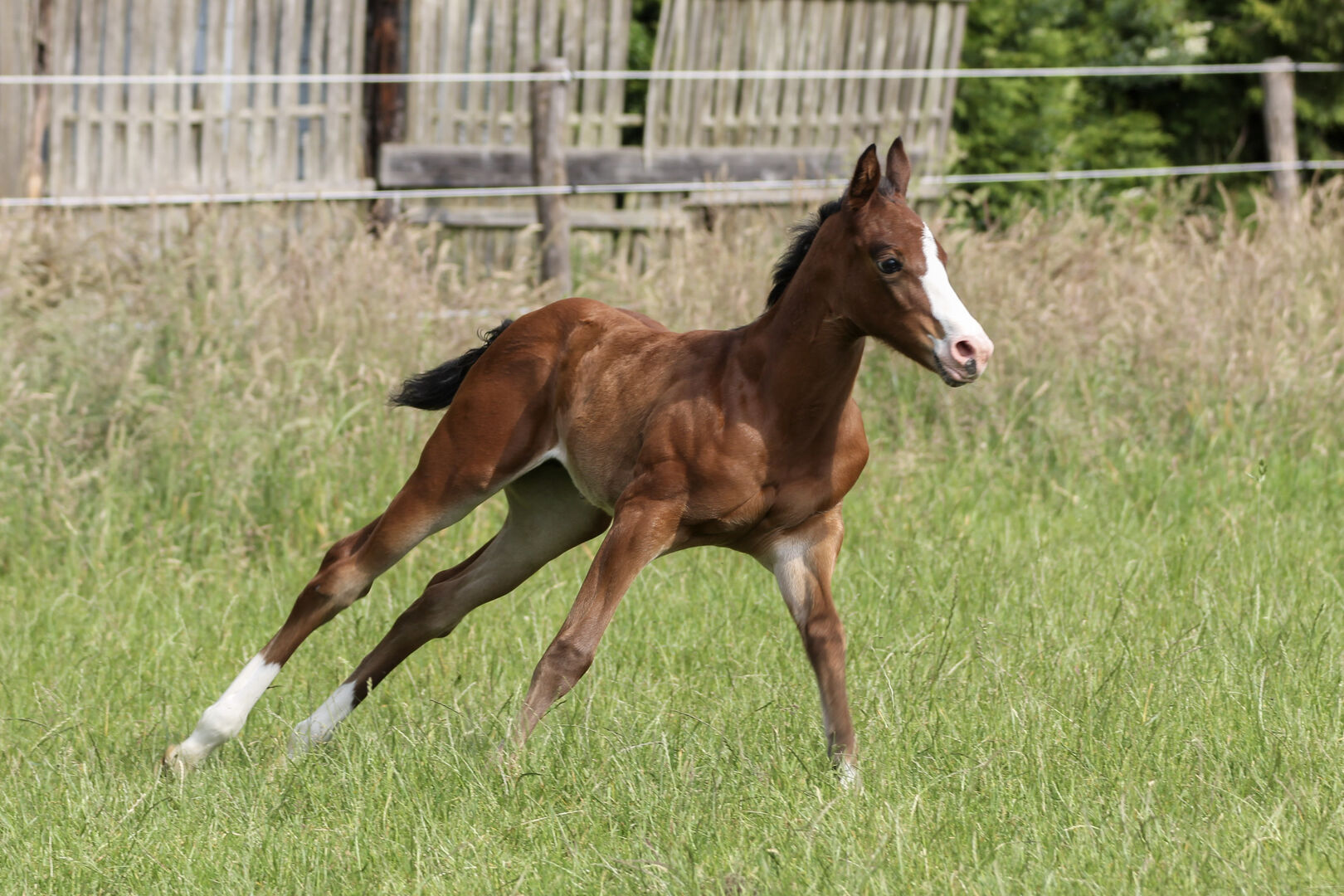 God Loves Chocolate - detta eleganta Quarter Horse-sto, född 6.2025 med en uppskattad sluthöjd på 150 cm, är ett riktigt blickfång med mycket uttryck och närvaro. Hon har en korrekt, bra konformation, är välmusklad och extremt atletisk. Hon är frisk och vital och är vaccinerad och avmaskad i enlighet med sin ålder när hon överlämnas. Schoki växer upp i en liten grupp med ston och föl, vistas i öppna stall och på ängar och är väl socialiserad. Hon är mycket människovänlig, nyfiken, gosig, vänlig, öppen och intresserad. Lätt att hantera, avslappnad, villig att lära sig och rör sig smidigt. Särskilt imponerande är hennes vackra marktäckning och hennes stora underrede. Detta innebär att hon också kan göra bra ifrån sig i pleasure. Schocki kommer att bli en riktig EWU-allrounder. Hancock möter cowhorse ? en framgångsrik outcross som verkligen övertygar. Kommer att säljas med AQHA-papper och en klinisk AKU kommer att beställas av uppfödaren som en del av försäljningen. Oavsett om det gäller sport, tävling eller fritid - det här fölet är mångsidigt och kommer också att göra fritidsryttaren med höga krav glad.
