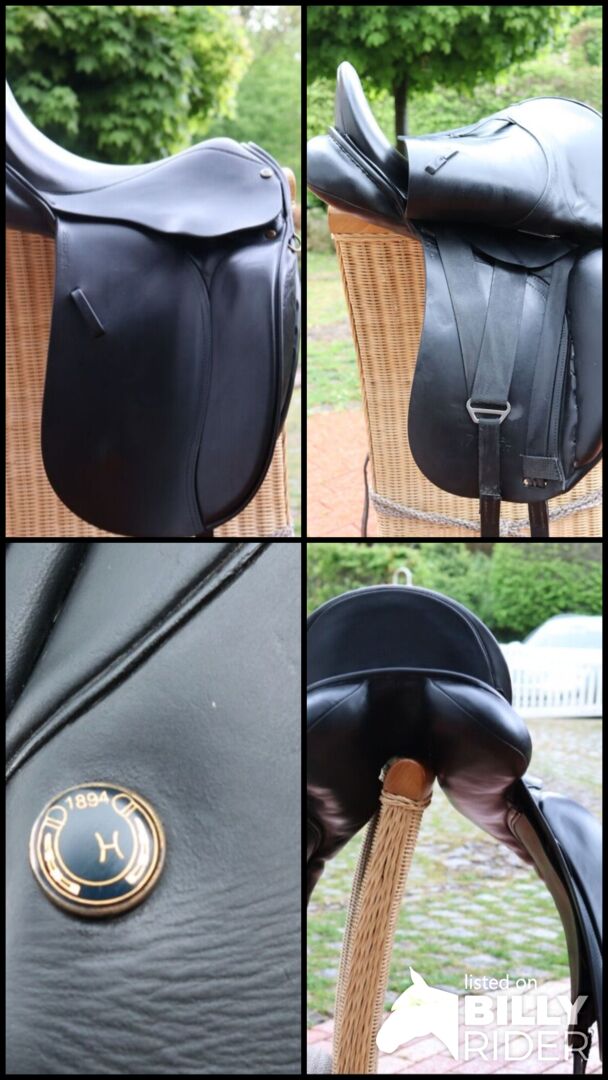 Väl underhållen Hintermayer dressyrsadel - Jag erbjuder vår mycket välskötta dressyrsadel till salu. Den är tillverkad av Hintermayer, modell Anatomic och har en sitsstorlek på 17". Sadeln har fina stora pommels, en djup sits och du är väldigt nära hästen. Den användes på min Tinker (stockmått 143) och har anpassats för breda hästar med korta ryggar, vilket är anledningen till att den har en stor bredd i munnen. Vår sadelmakare tog också bort mycket ull från panelerna framtill så att sadeln är ännu bredare och ger mer axelfrihet. Den kan också justeras för att passa andra hästar utan problem, eftersom den tidigare användes på ett varmblod. Sadeln har en V-grimma, som inte går över fingerborgen, för att begränsa axeln så lite som möjligt. Dessutom har sadelklaffen en ögla på undersidan genom vilken man kan föra sadelgjorden. Detta gör att sadelklaffen kan fästas extra och ligger tätare och fastare på hästen. Öglan har tyvärr lossnat på vänster sida (se bilderna), men kan sys på igen utan problem.